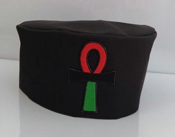 This is a beautiful African black hat, Kufi. Fabric is cotton and polyester. Kufi is black with red, green and red Ankh symbol patch. This hat can be worn for Kwanzaa and other cultural events, to special occasions or everyday wear.