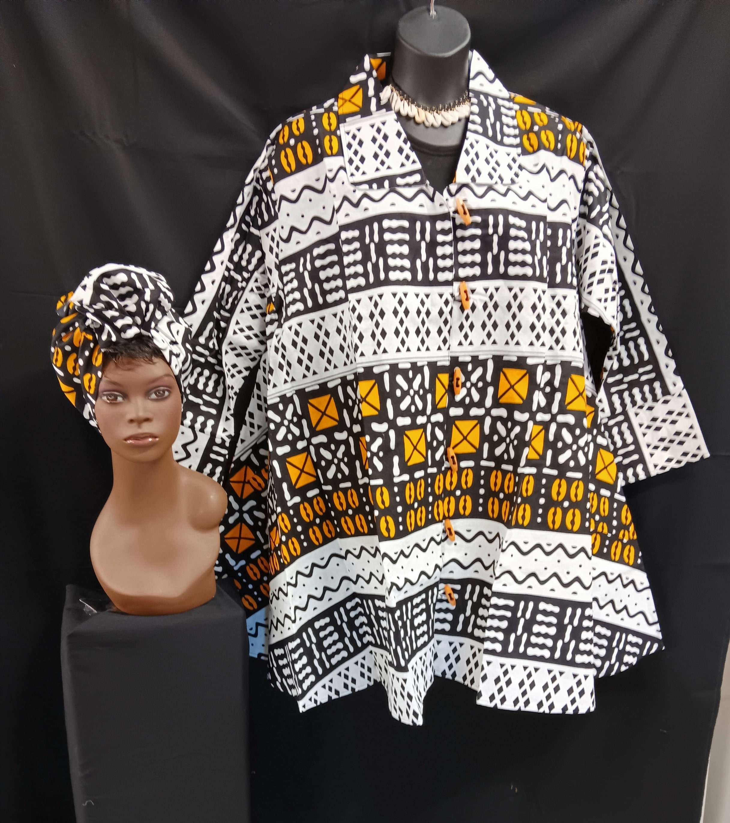 Beautiful African print Black, yellow, and white jacket dress with matching headwrap. Swing style, wooden Button down front and pockets. Garment is perfect for office causal to semi formal occasions all year-round. 100% cotton.