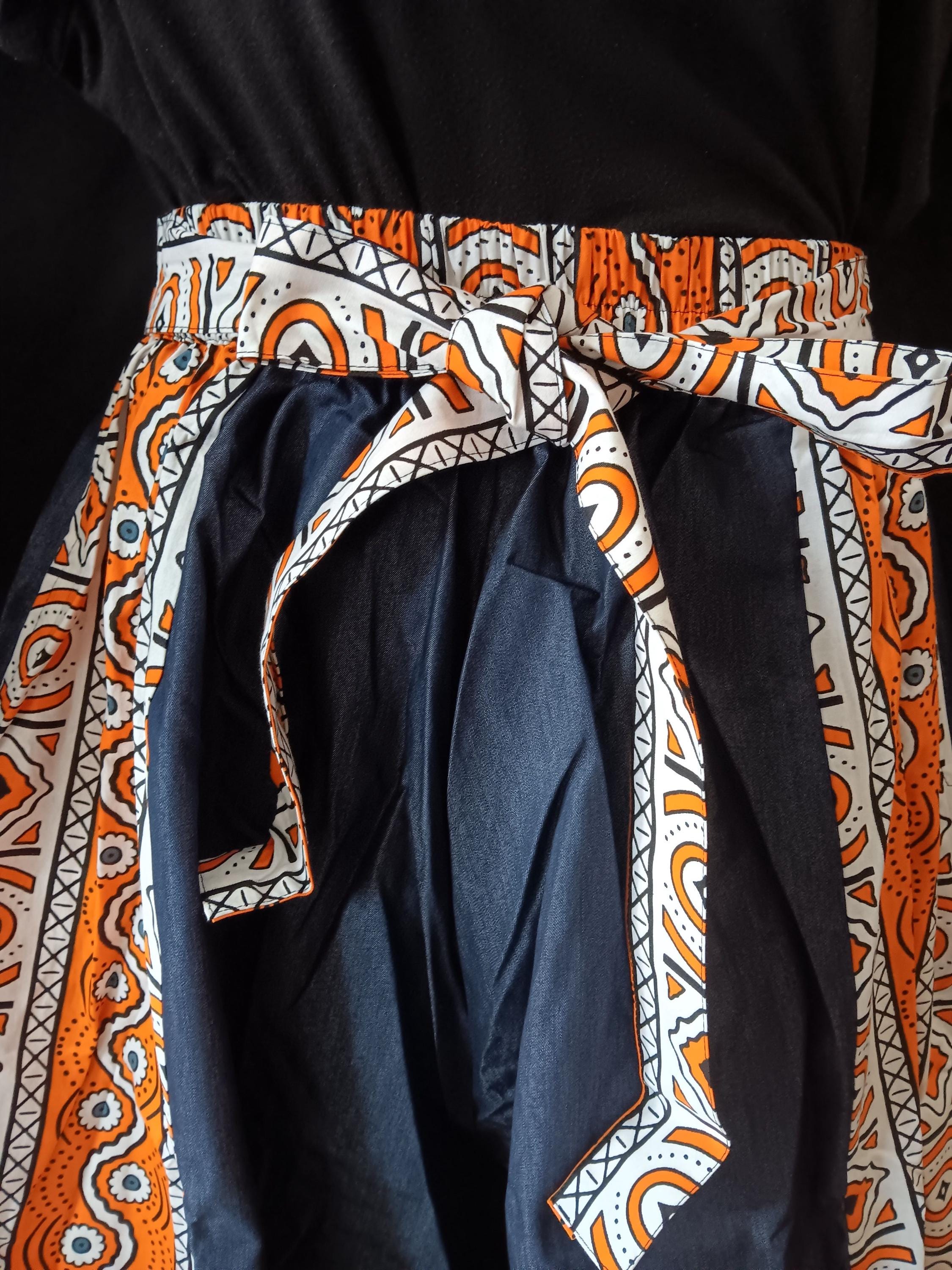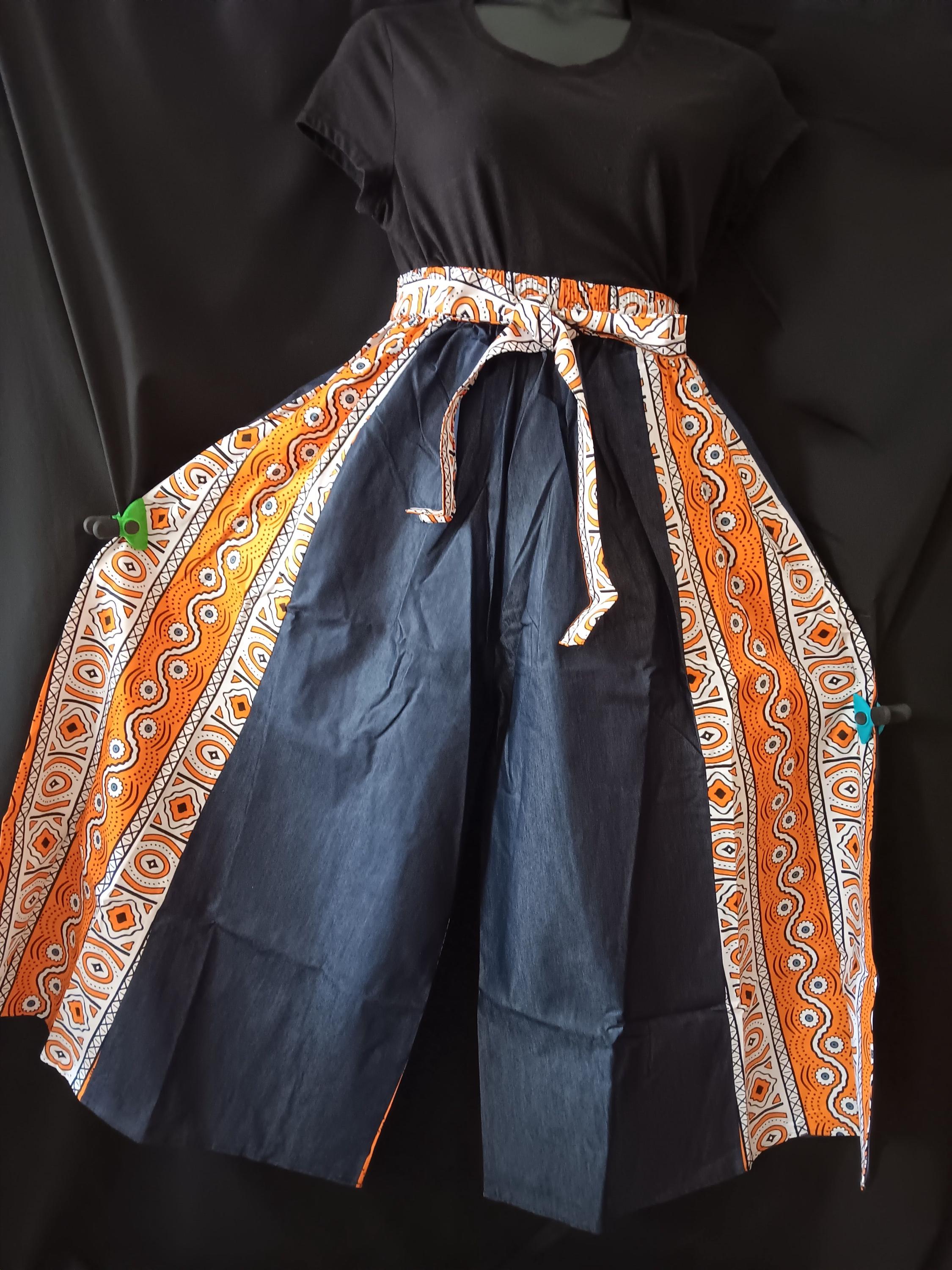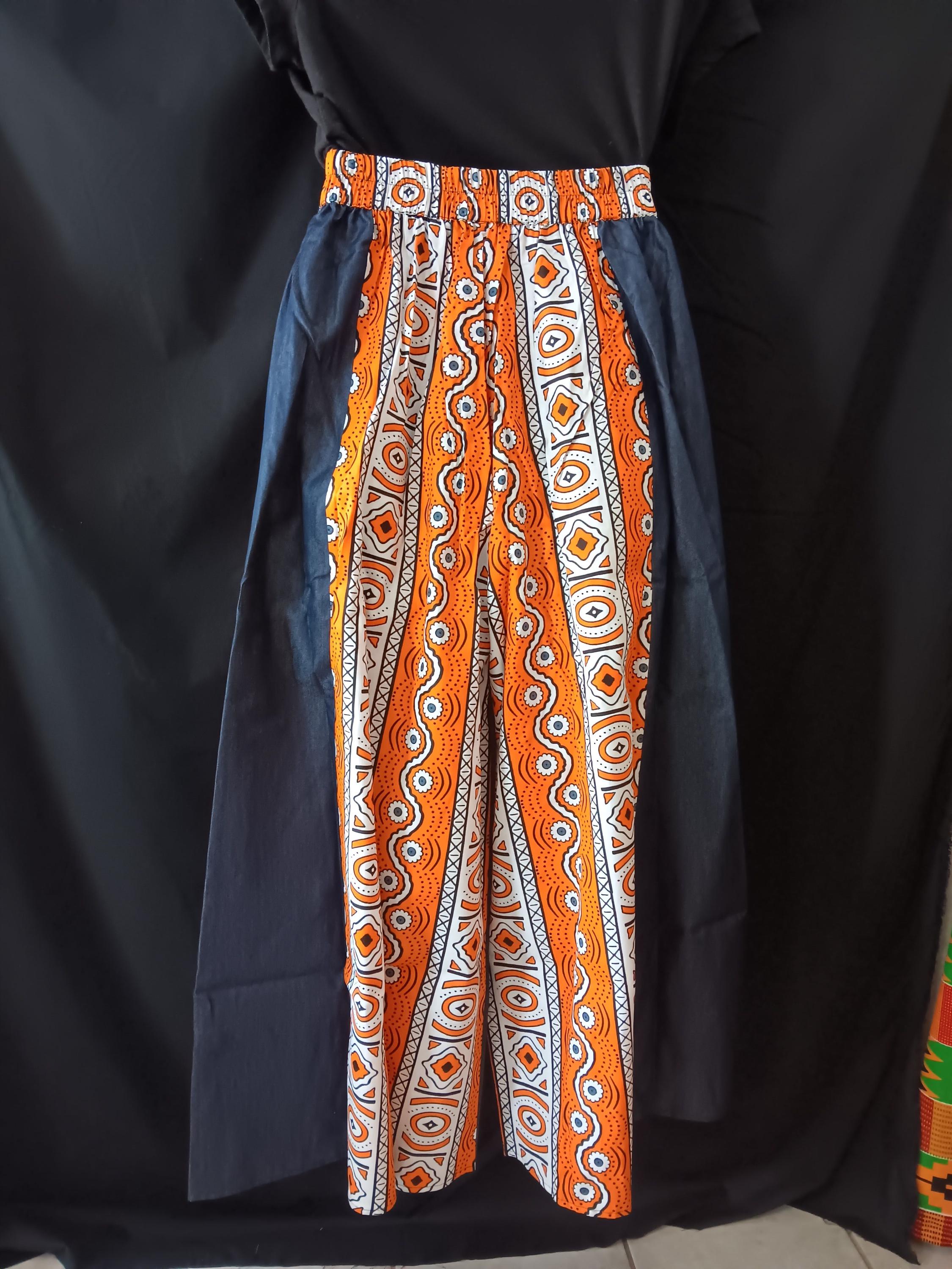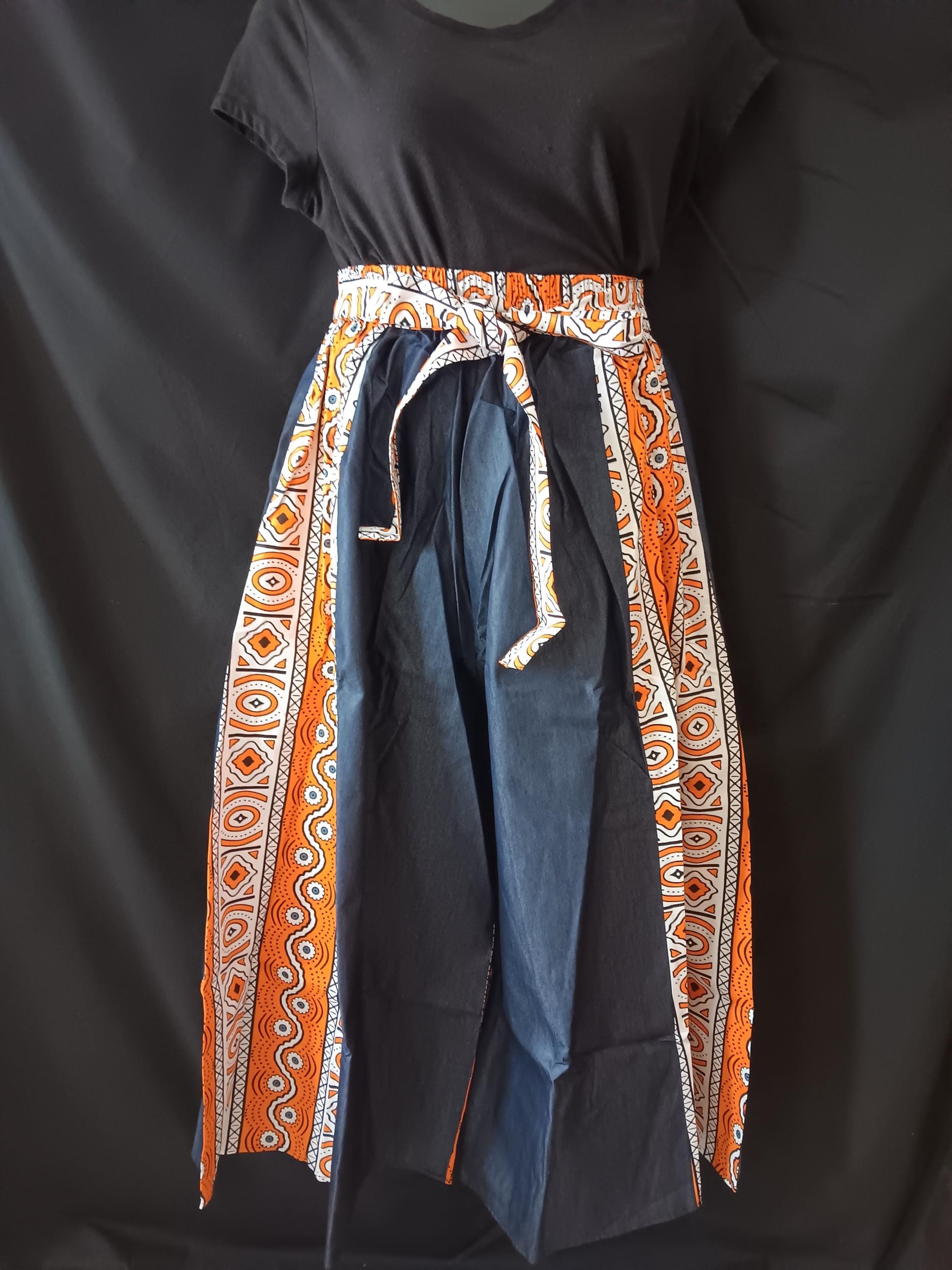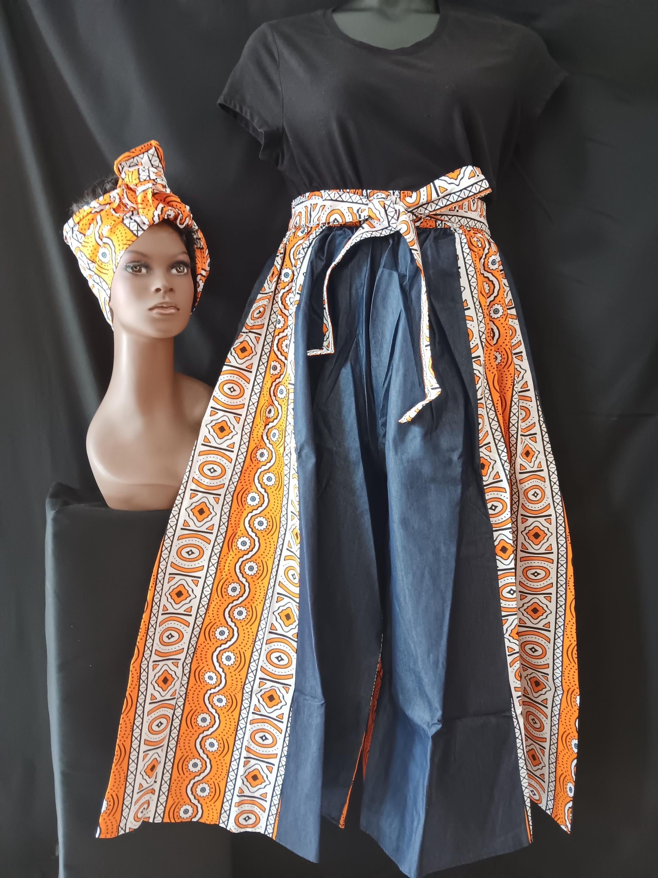 Beautiful Africa inspired Palazzo pants with pockets and matching headwrap truly makes a statement. Denim and Africa fabric mix. Elastic waist with tie belt.