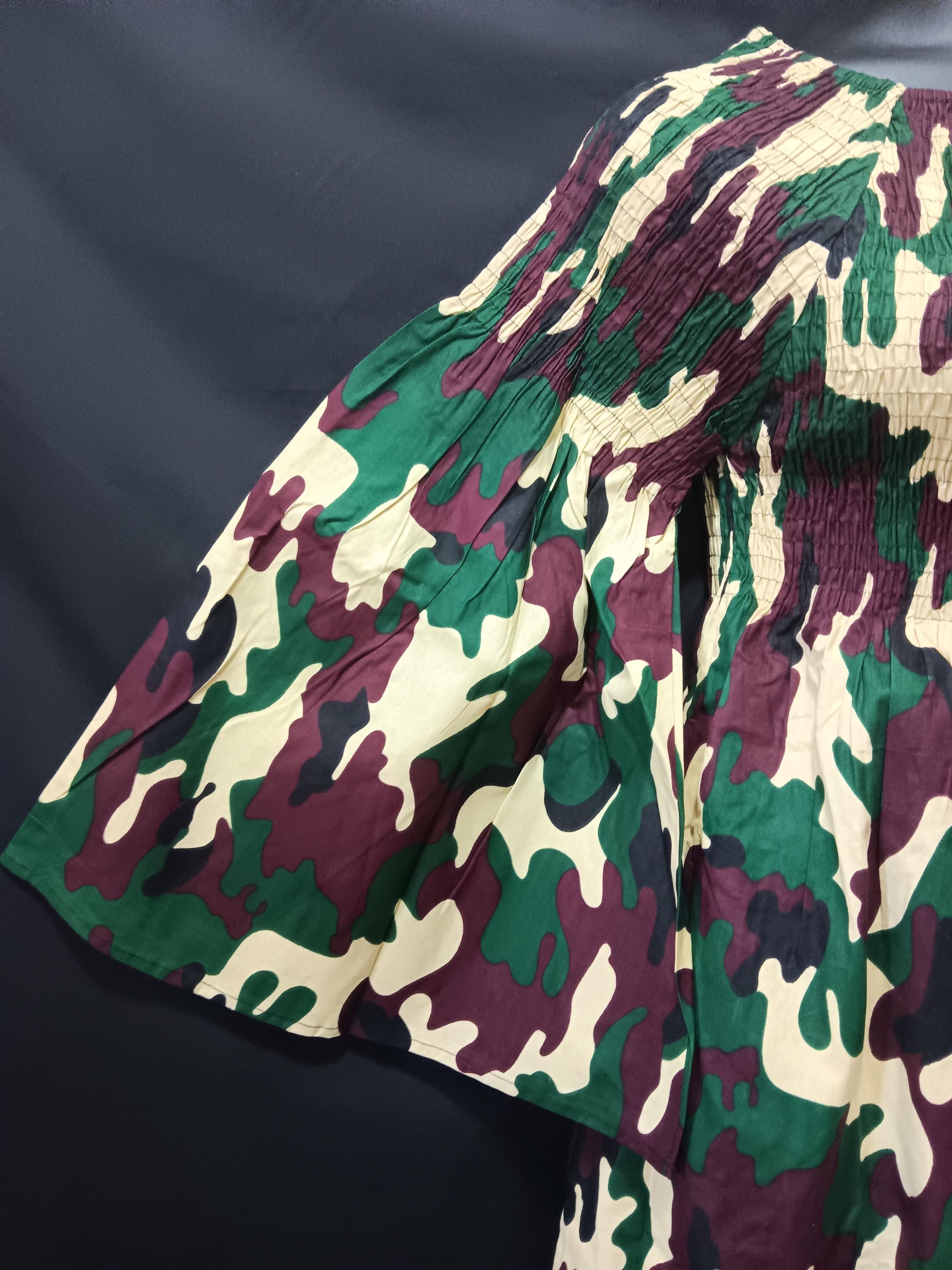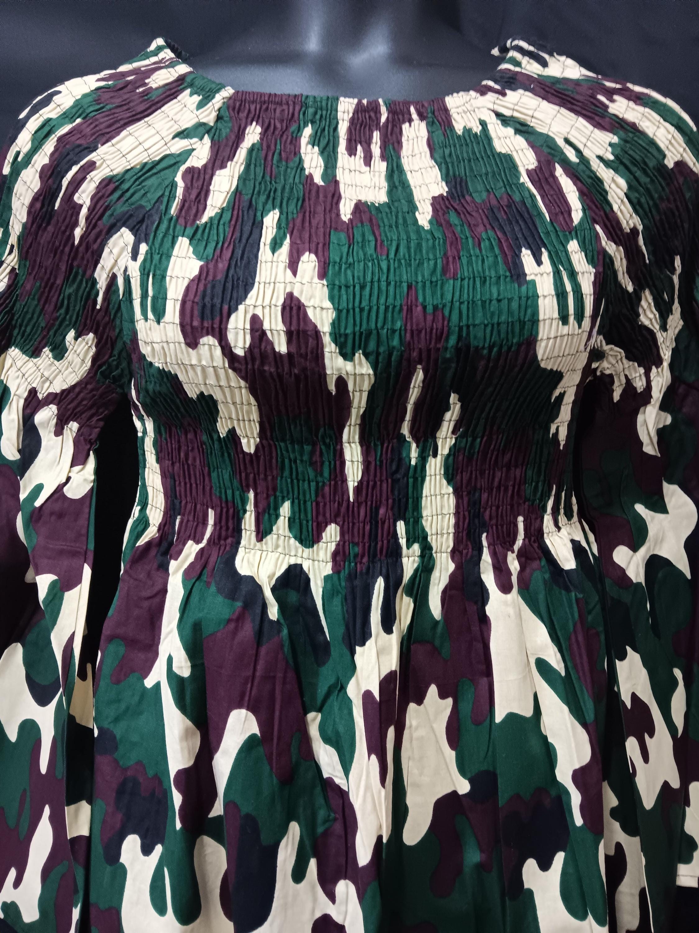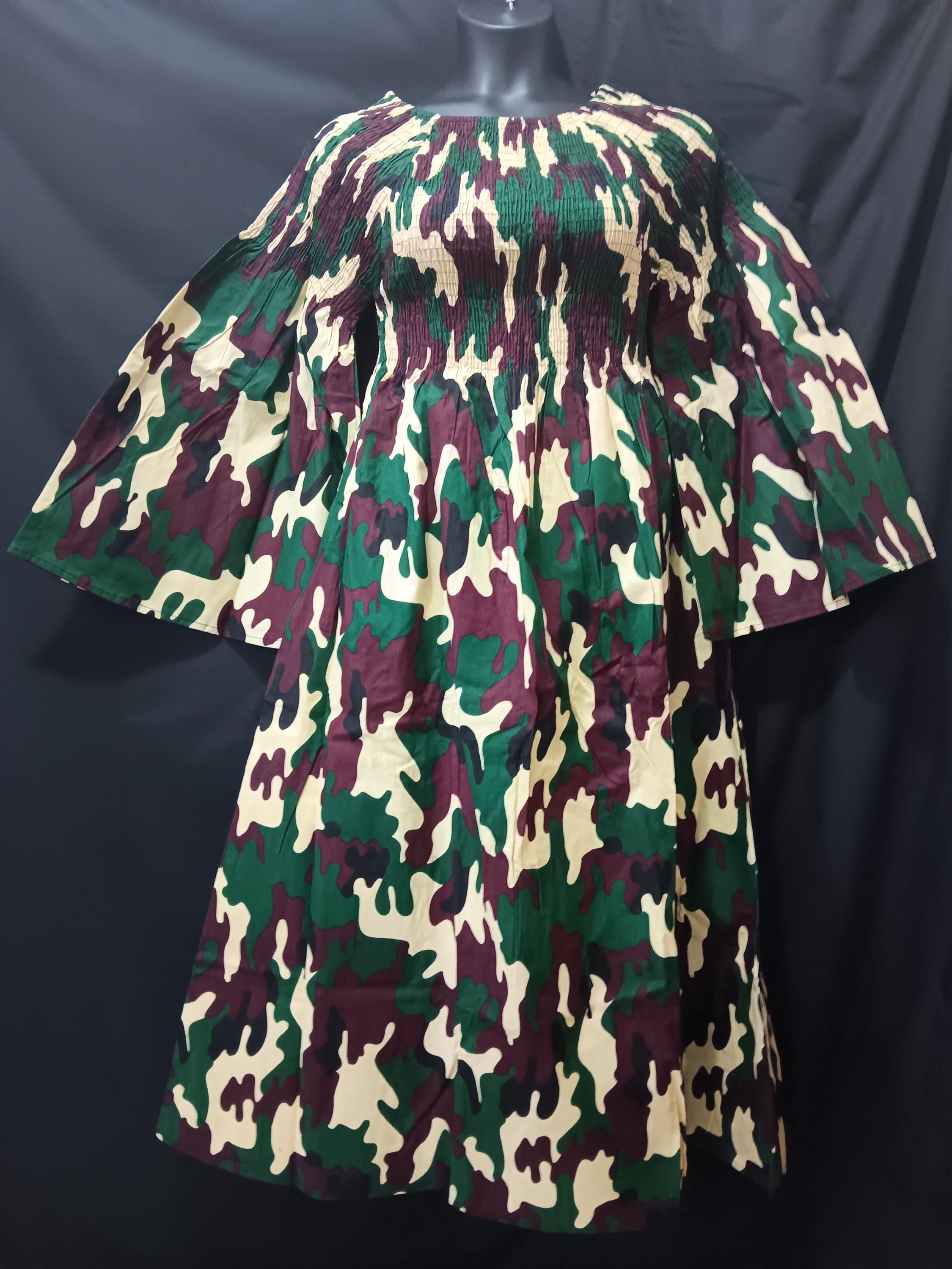 Beautiful African print Dress with matching headwrap. Camouflage print fabric, colors brown, light green and dark green.
