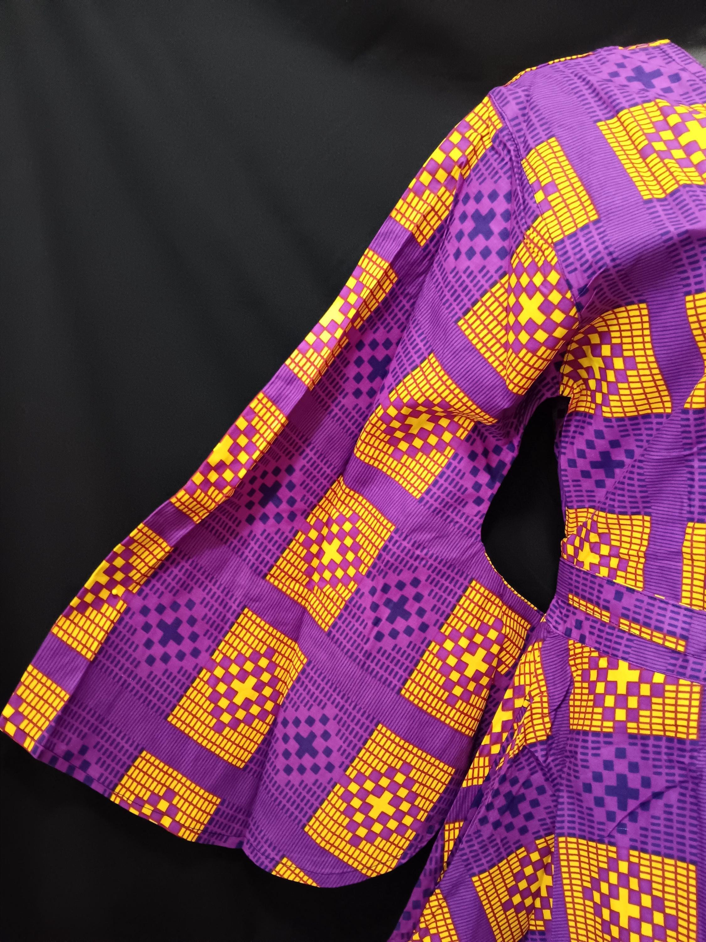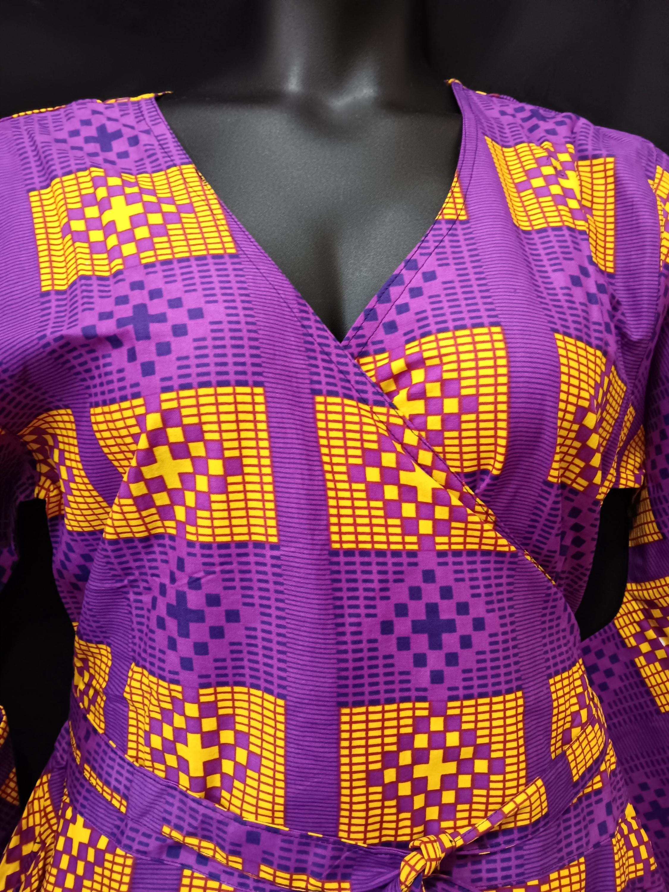 African print women's wrap dress. Ankle length with Long flowing sleeves . Dress has pockets and matching headwrap. African print fabric colors Yellow, Medium and dark purple. 100% Cotton. Lovely dress may be worn all occasions all year round.
