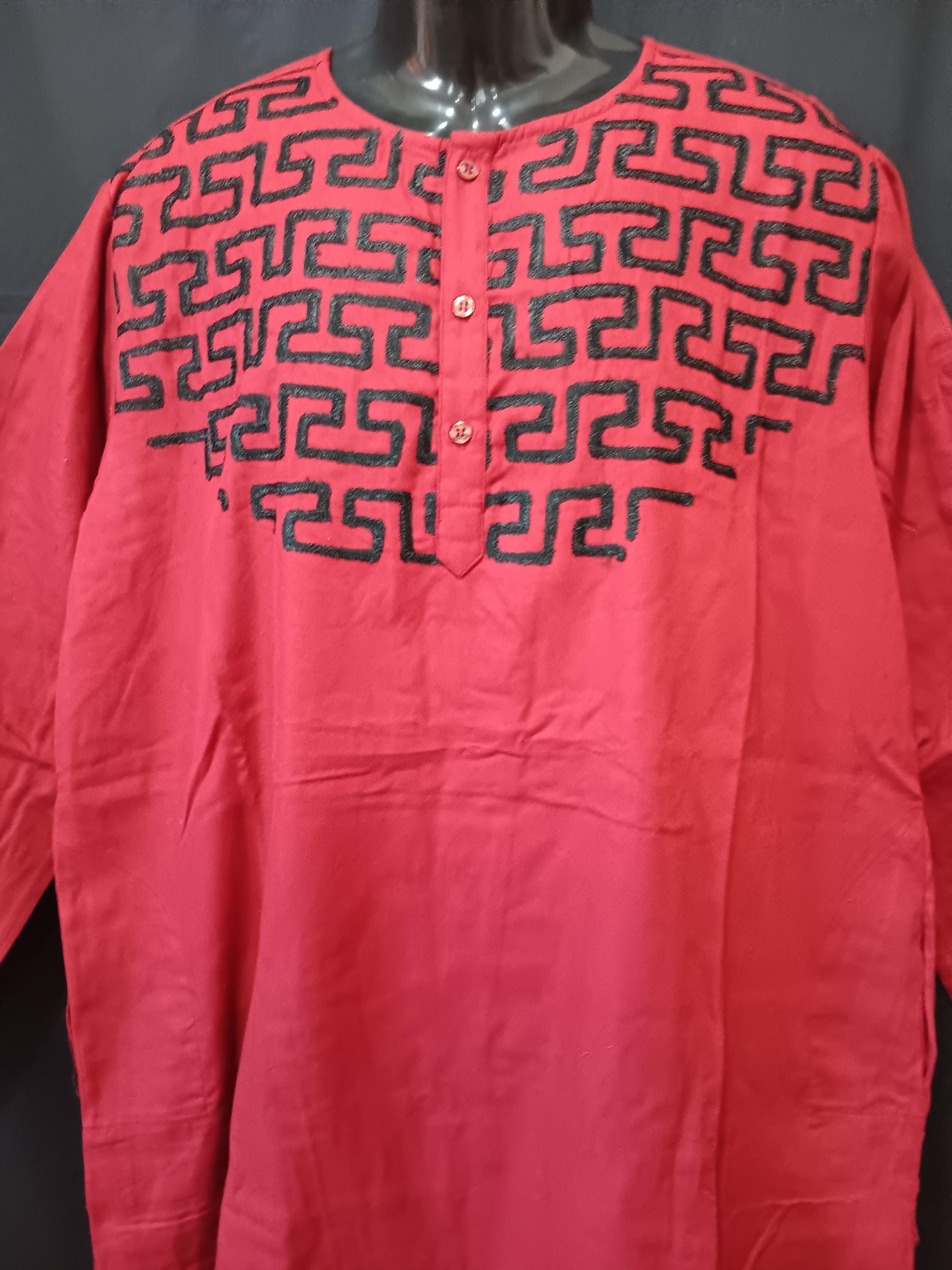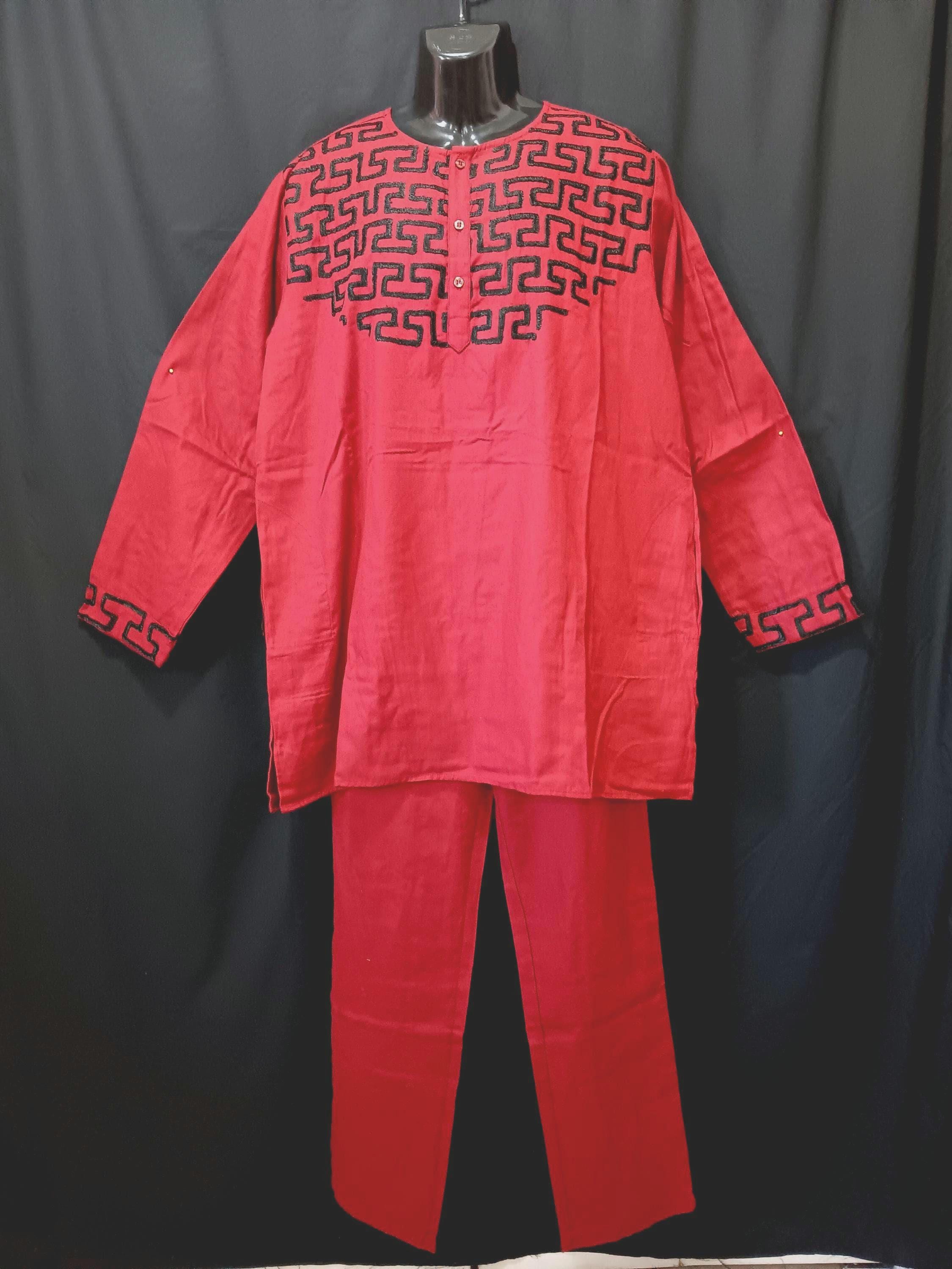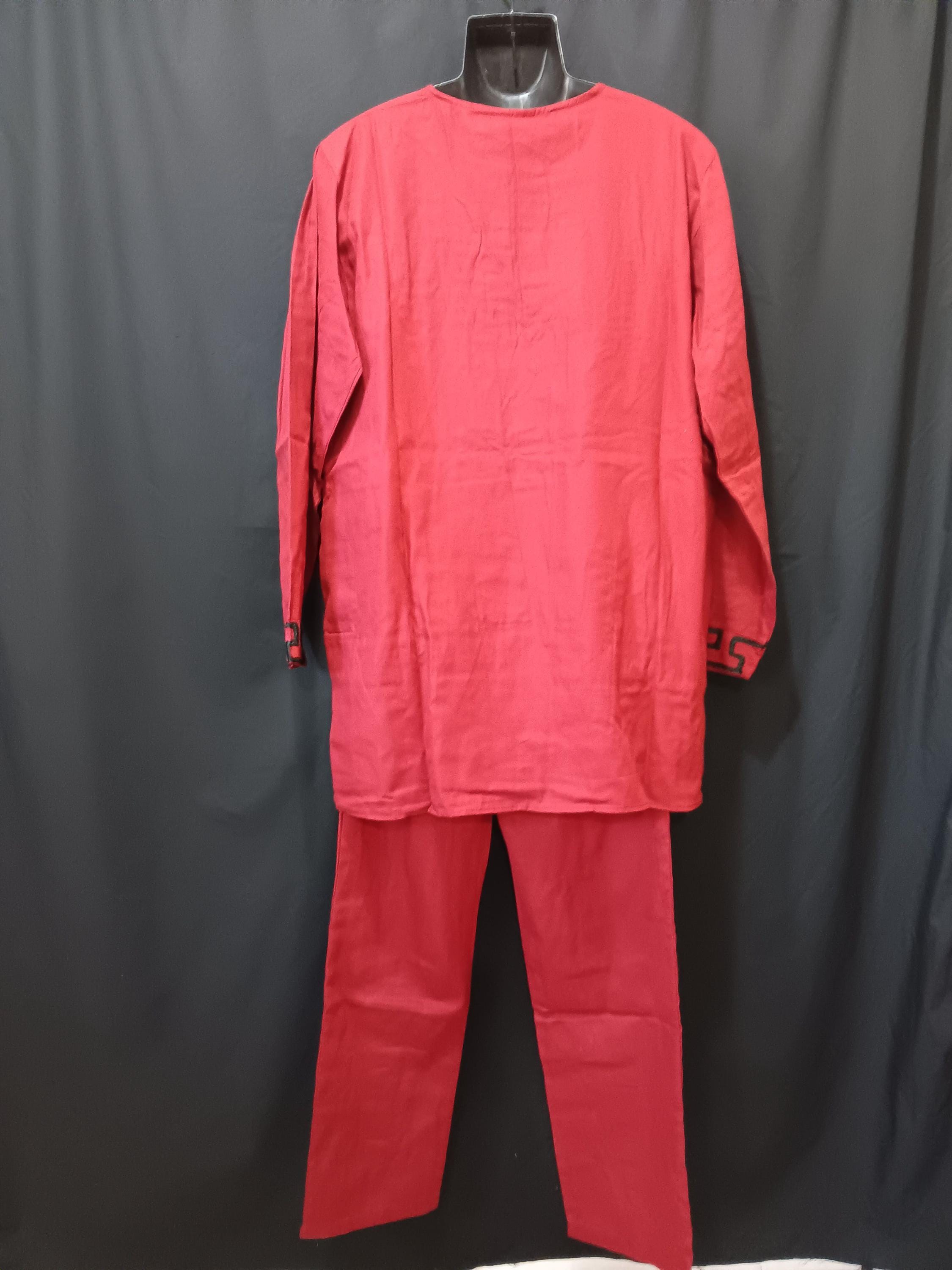Beautiful 2pc African solid Maroon Red and black embroidery. Long sleeve men's shirt, 3 button neck with pockets. Pants have elastic back waist with 1 button front zipper and pockets. (Small kufi cap included)