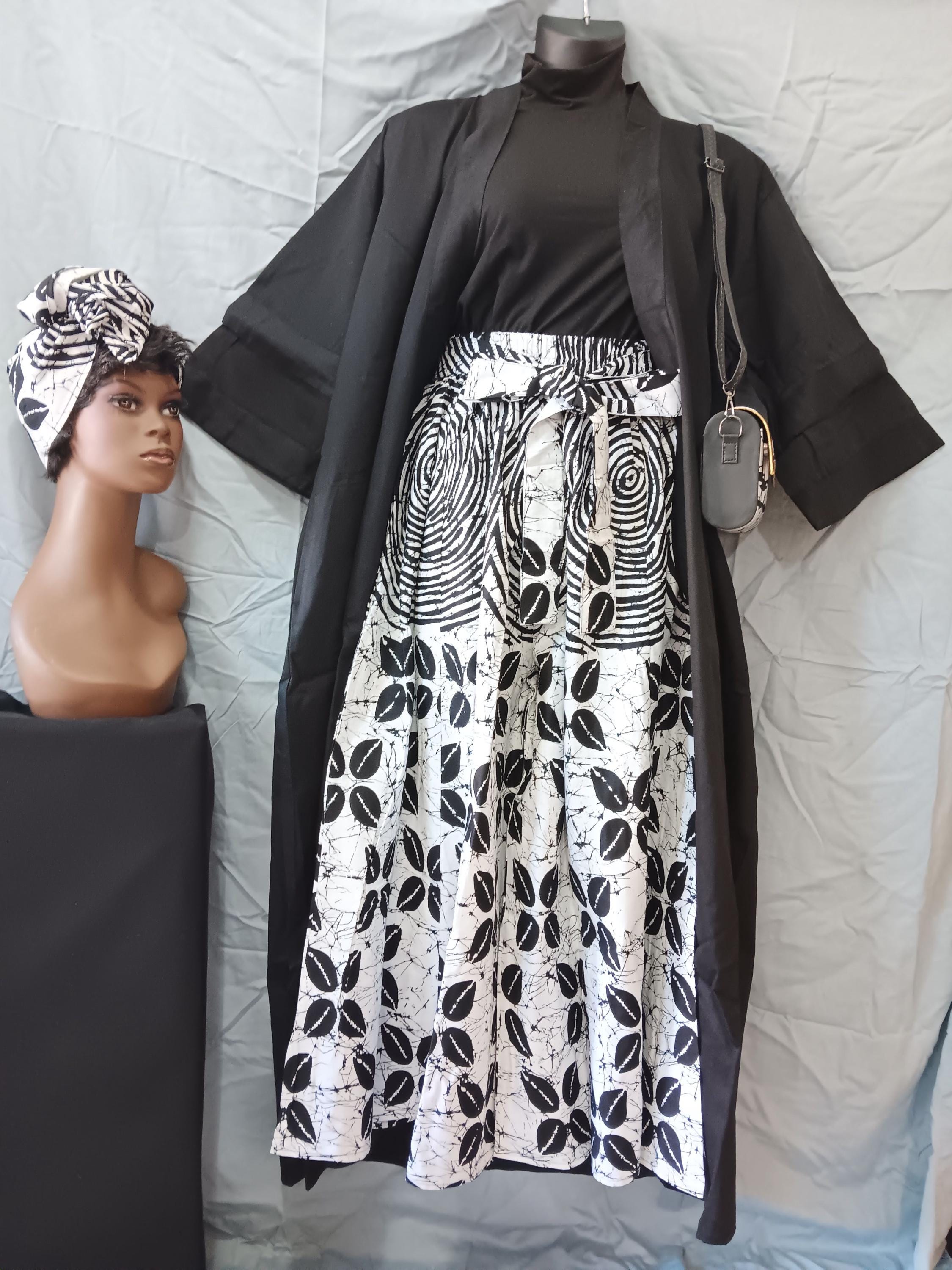 Africa inspired Beautiful African 4 pc set. Long Kimono top with mid-length 2 ruffle sleeve and pockets and matching headwrap.