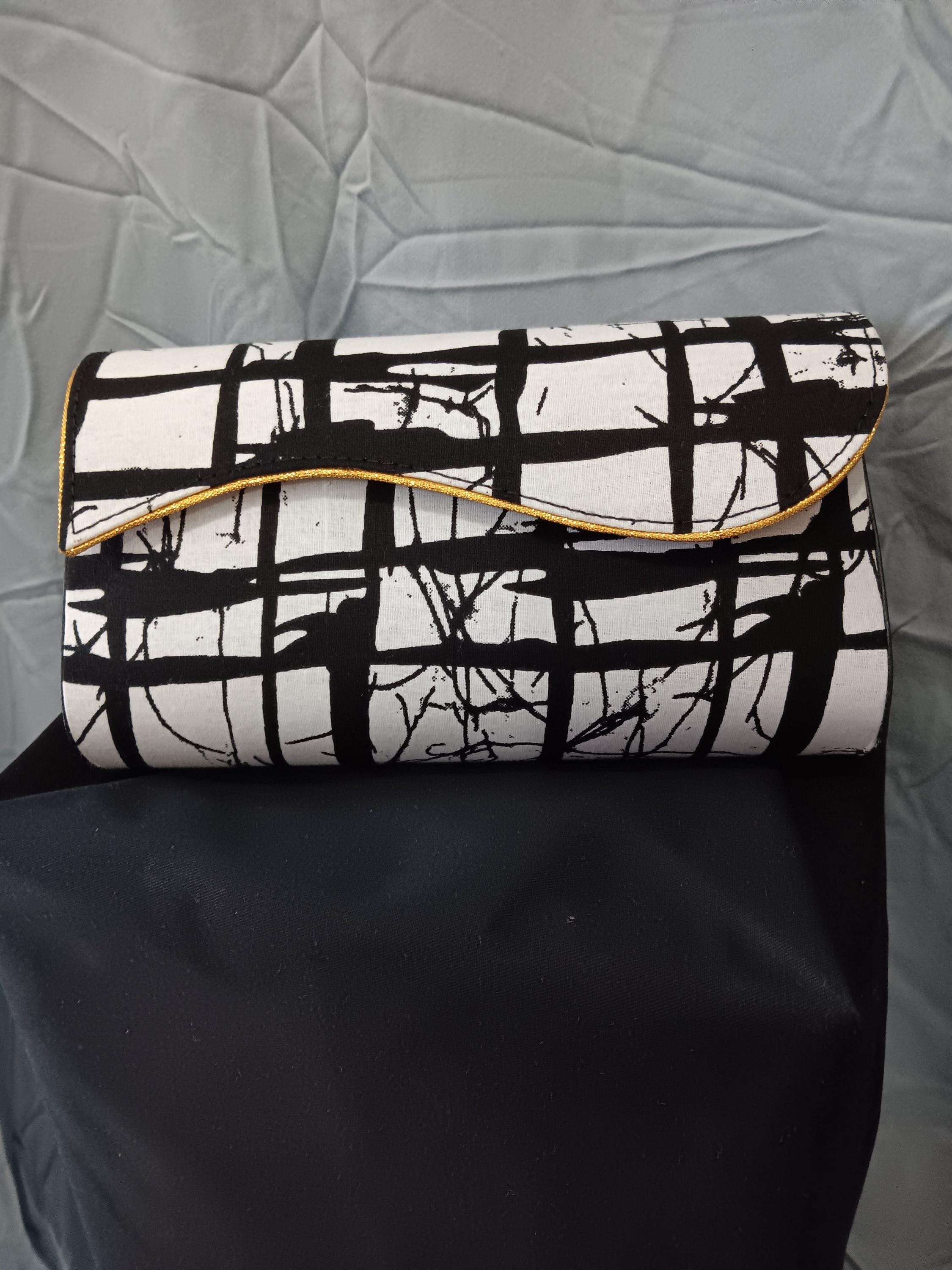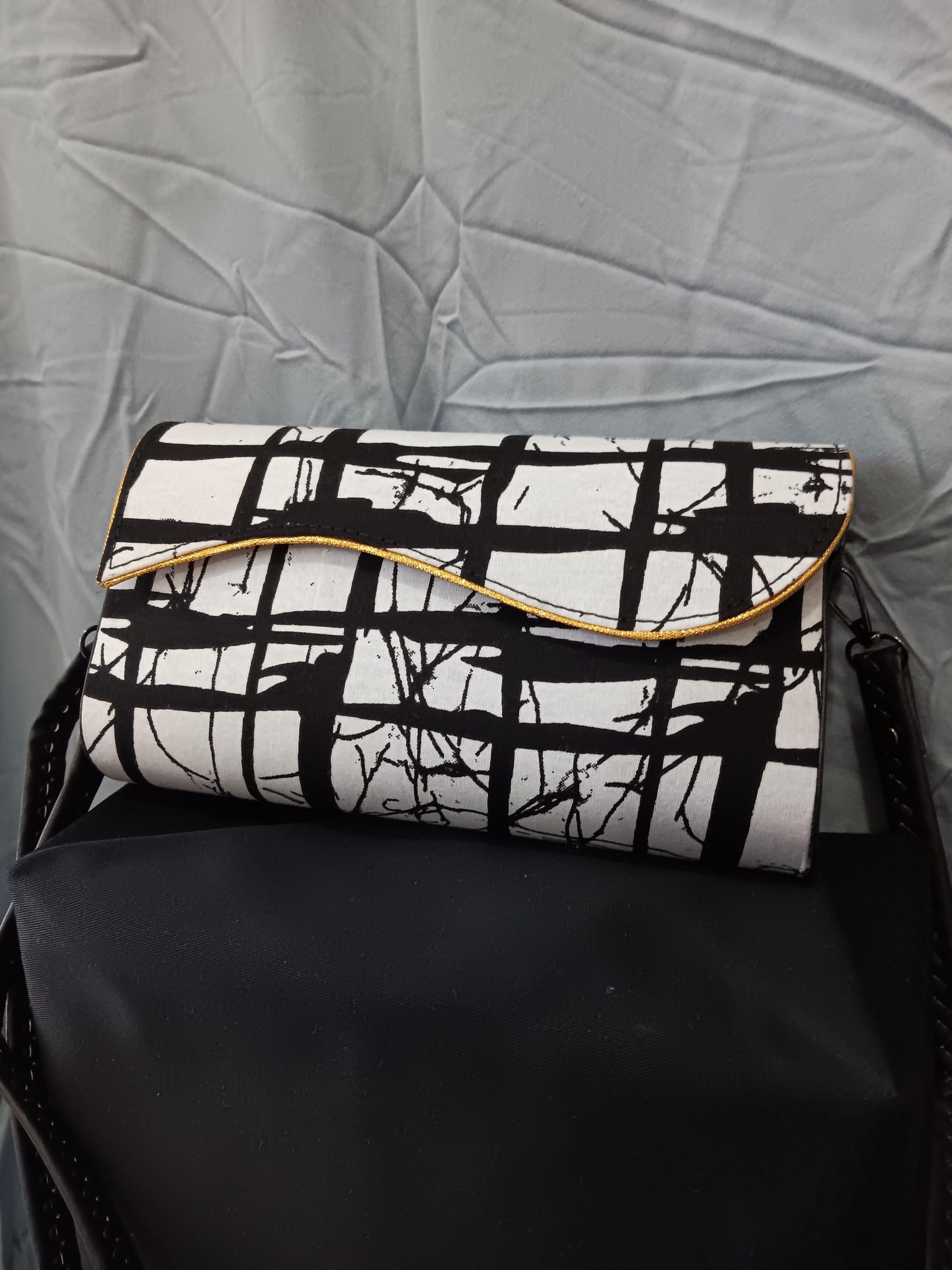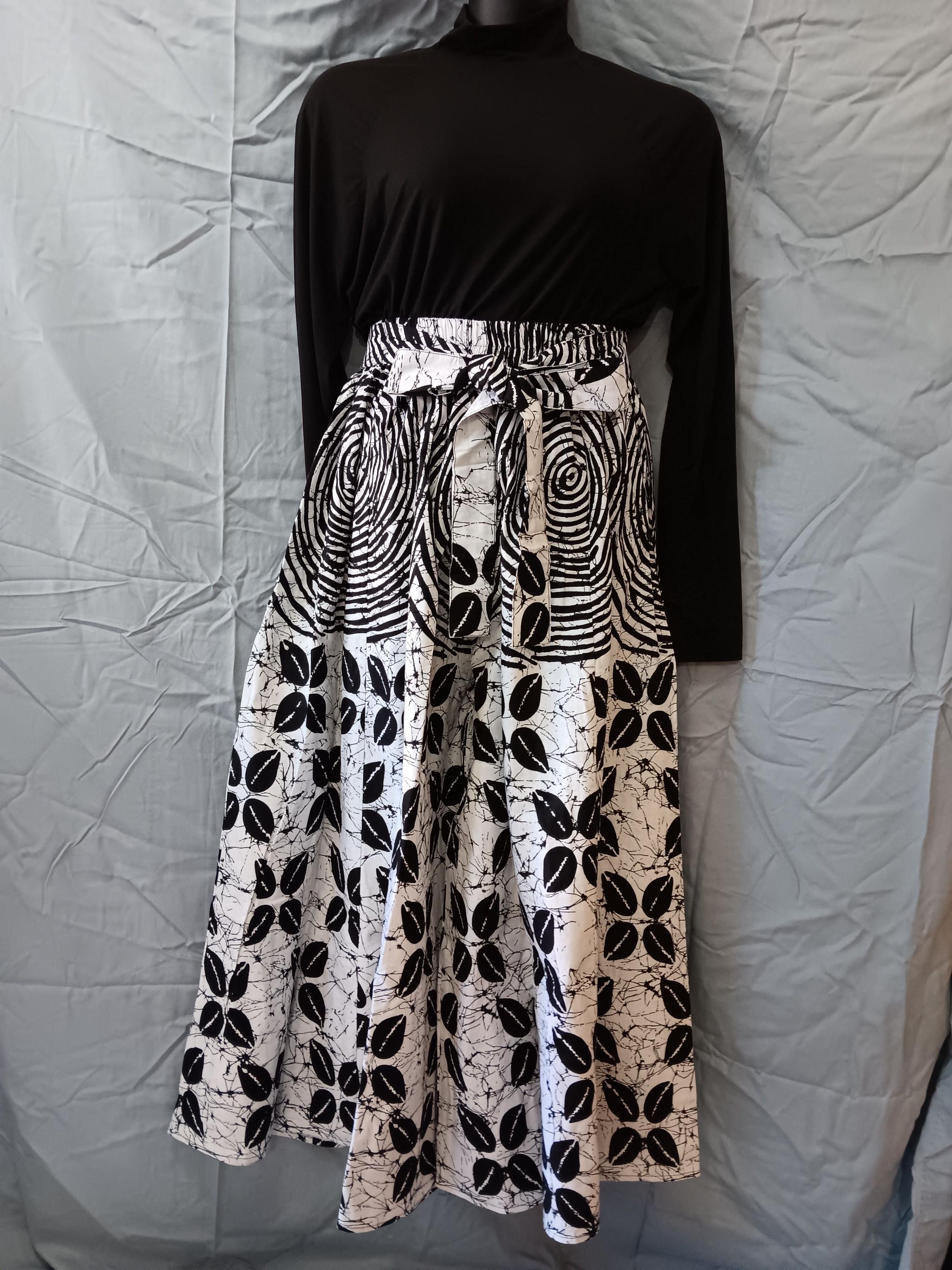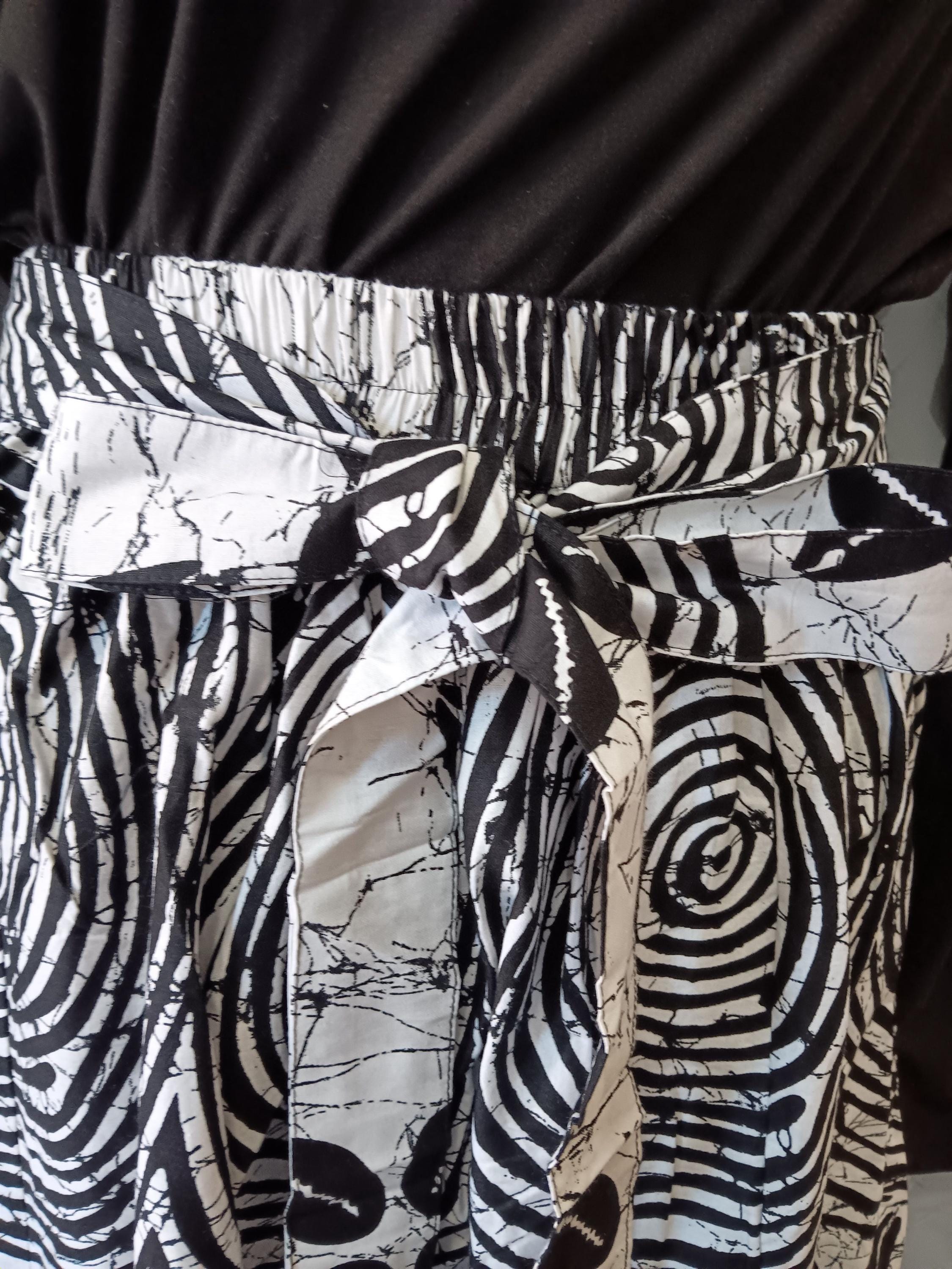 Palazzo pants with elastic waist tie belt and pockets, with matching purse and head wrap, Black and light gray print.