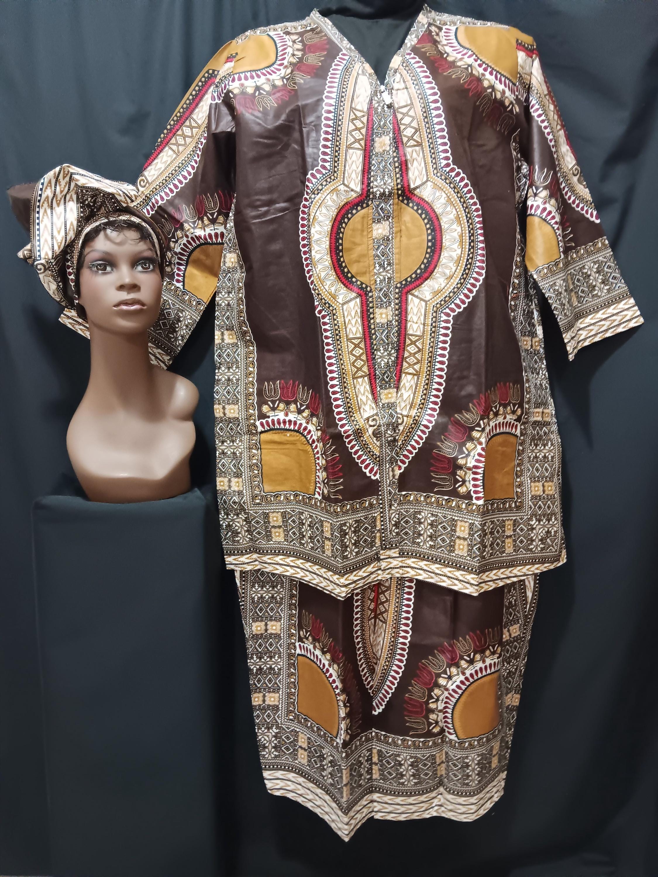 Lovely Africa inspired 3pc Pants set. Long sleeve zipper front jacket top top with pockets, elastic waist tie belt pants with pockets and matching headwrap.