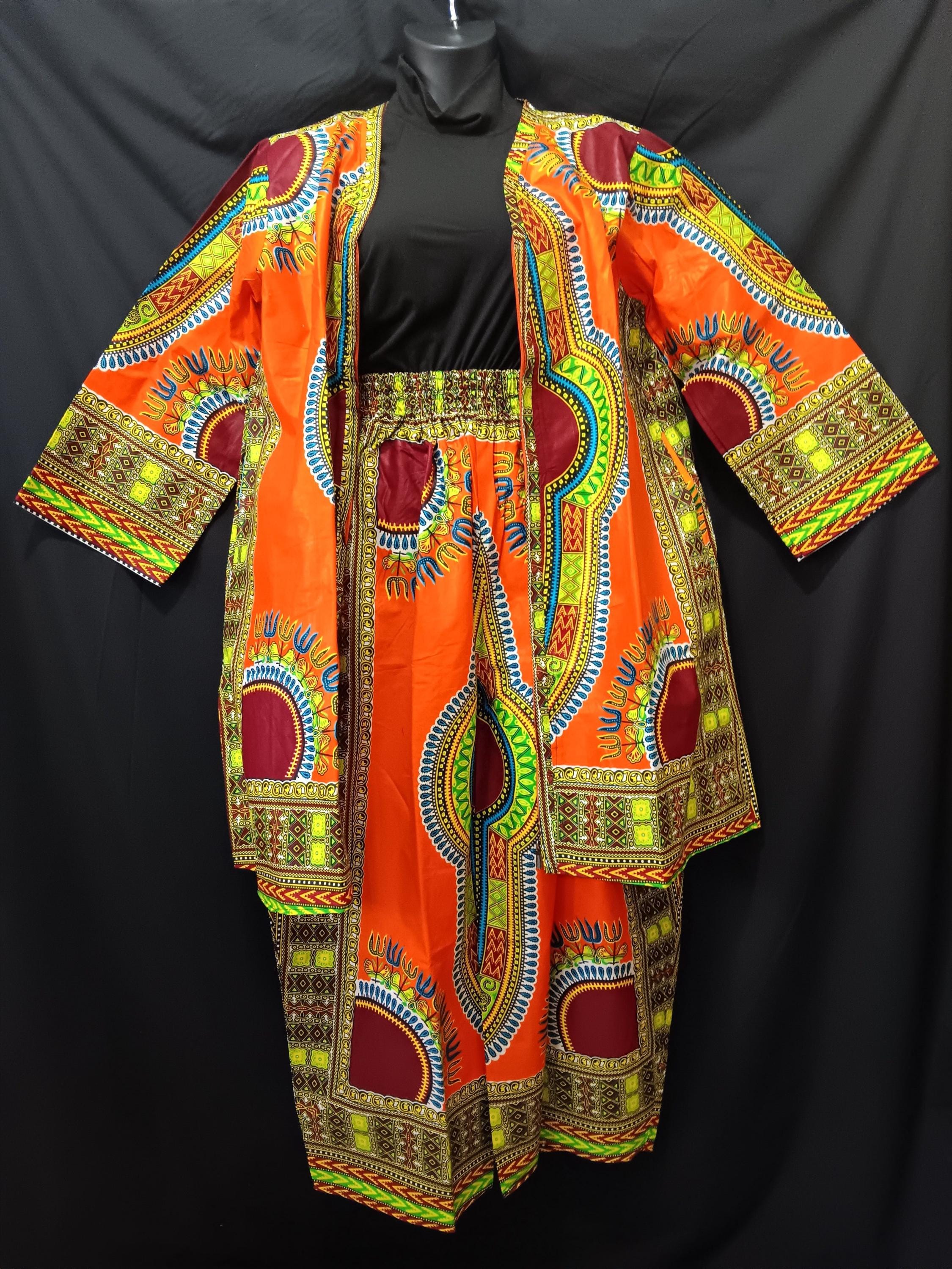 Lovely Africa inspired 3pc Duster Pants set. Long sleeve ankle length kimono top with pockets, elastic waist tie belt pants with pockets and matching headwrap.