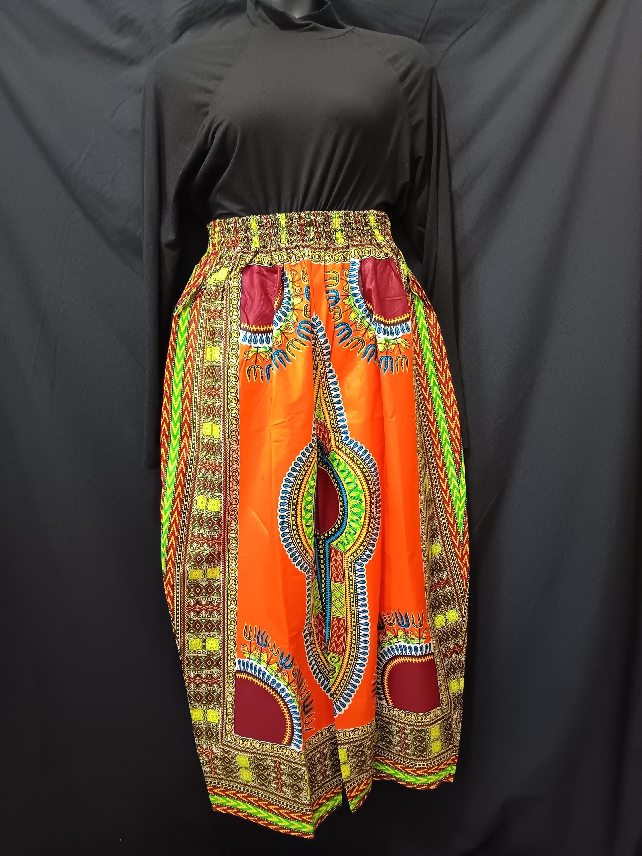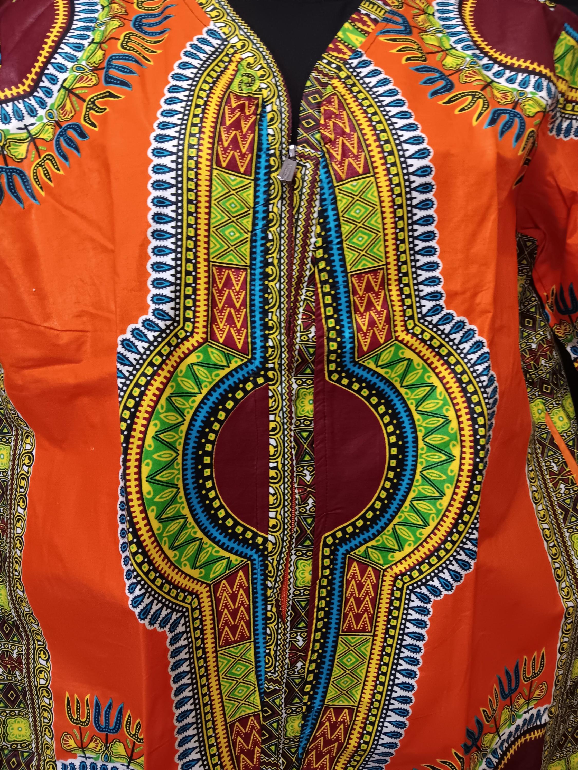 Beautiful Africa Dashiki print fabric. Colors are Orange, red, blue, yellow, green, white and black. Well-made garment. 100% Cotton.