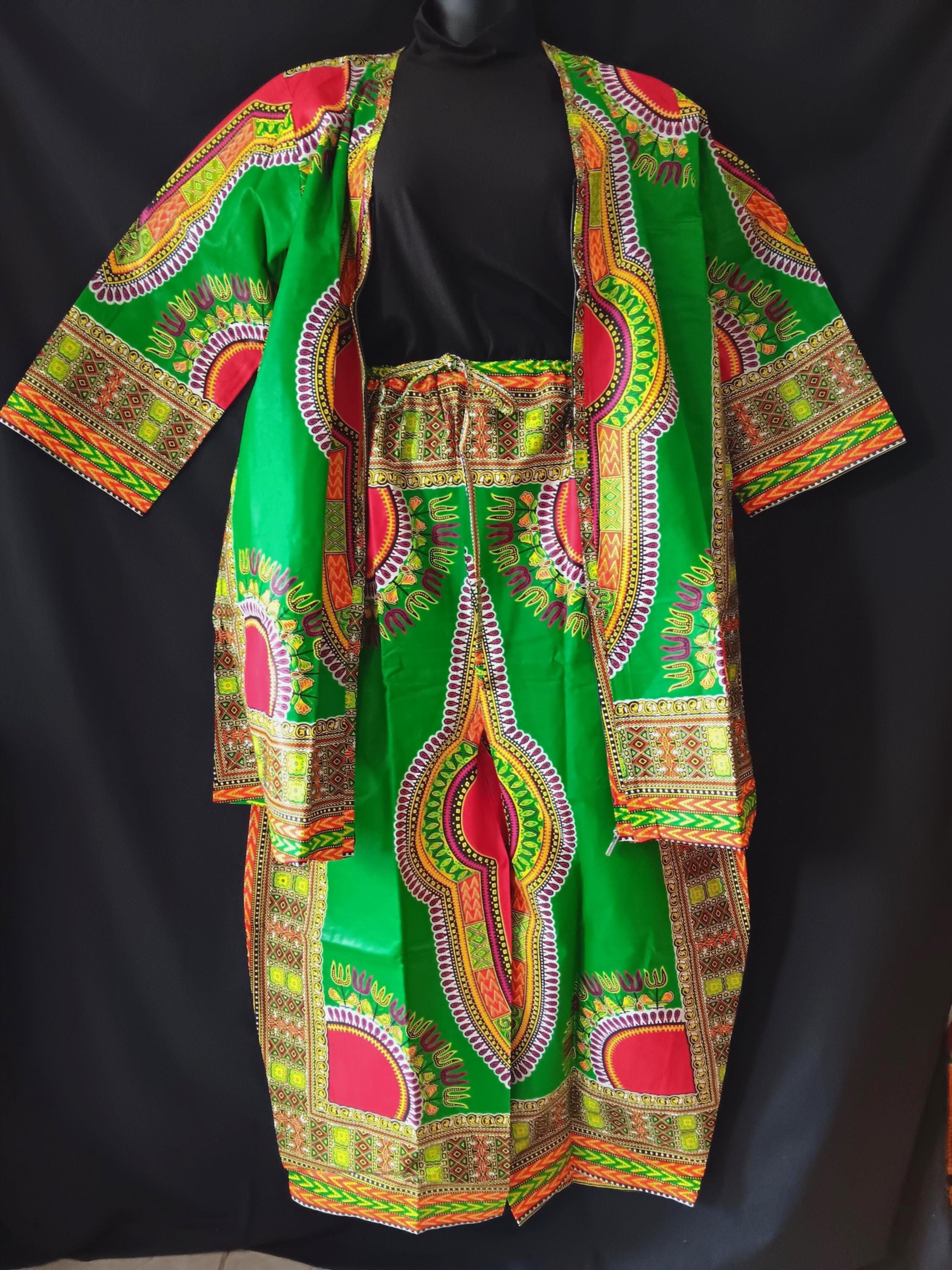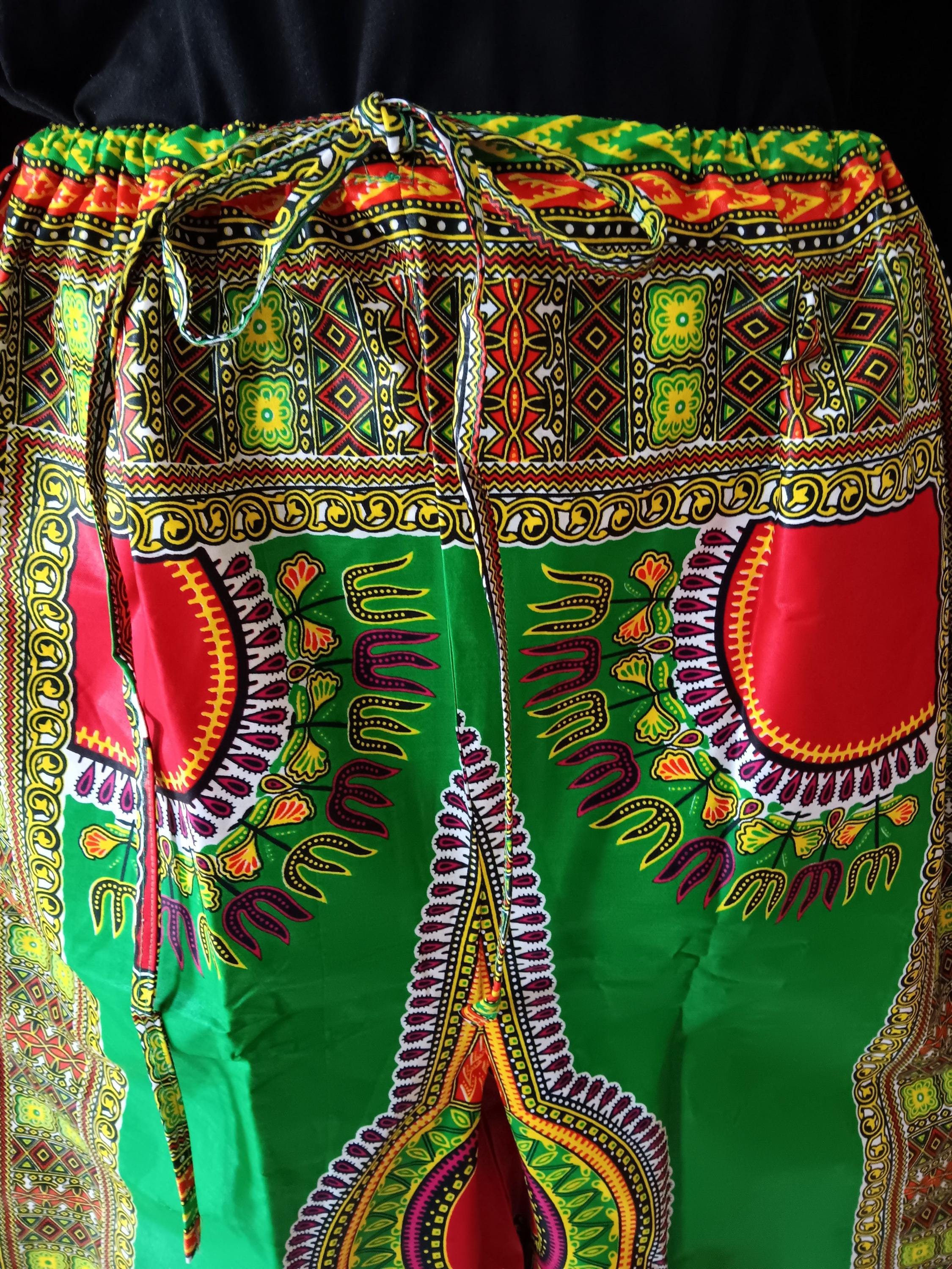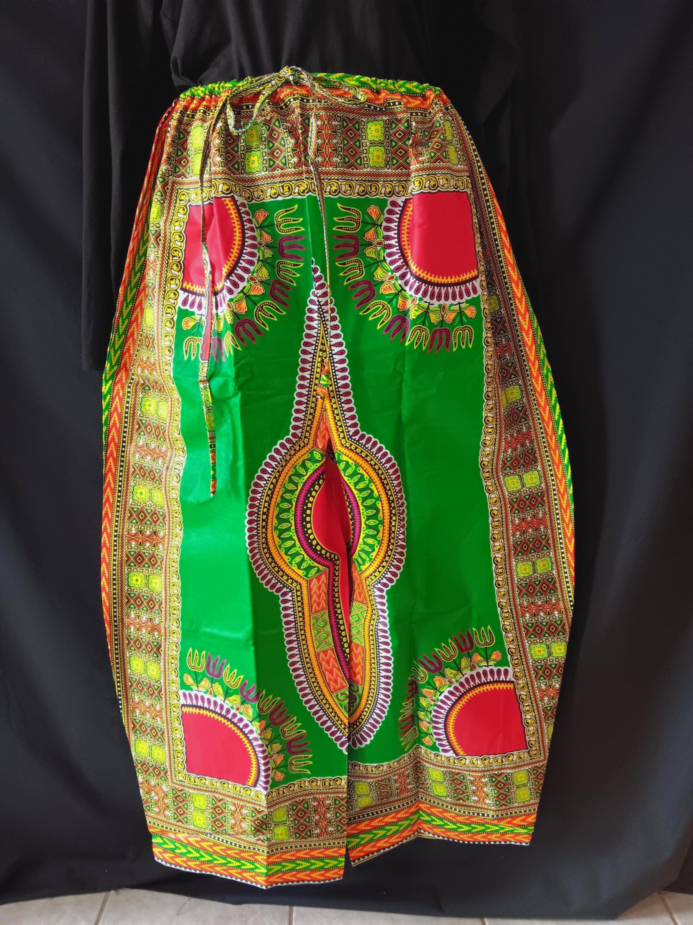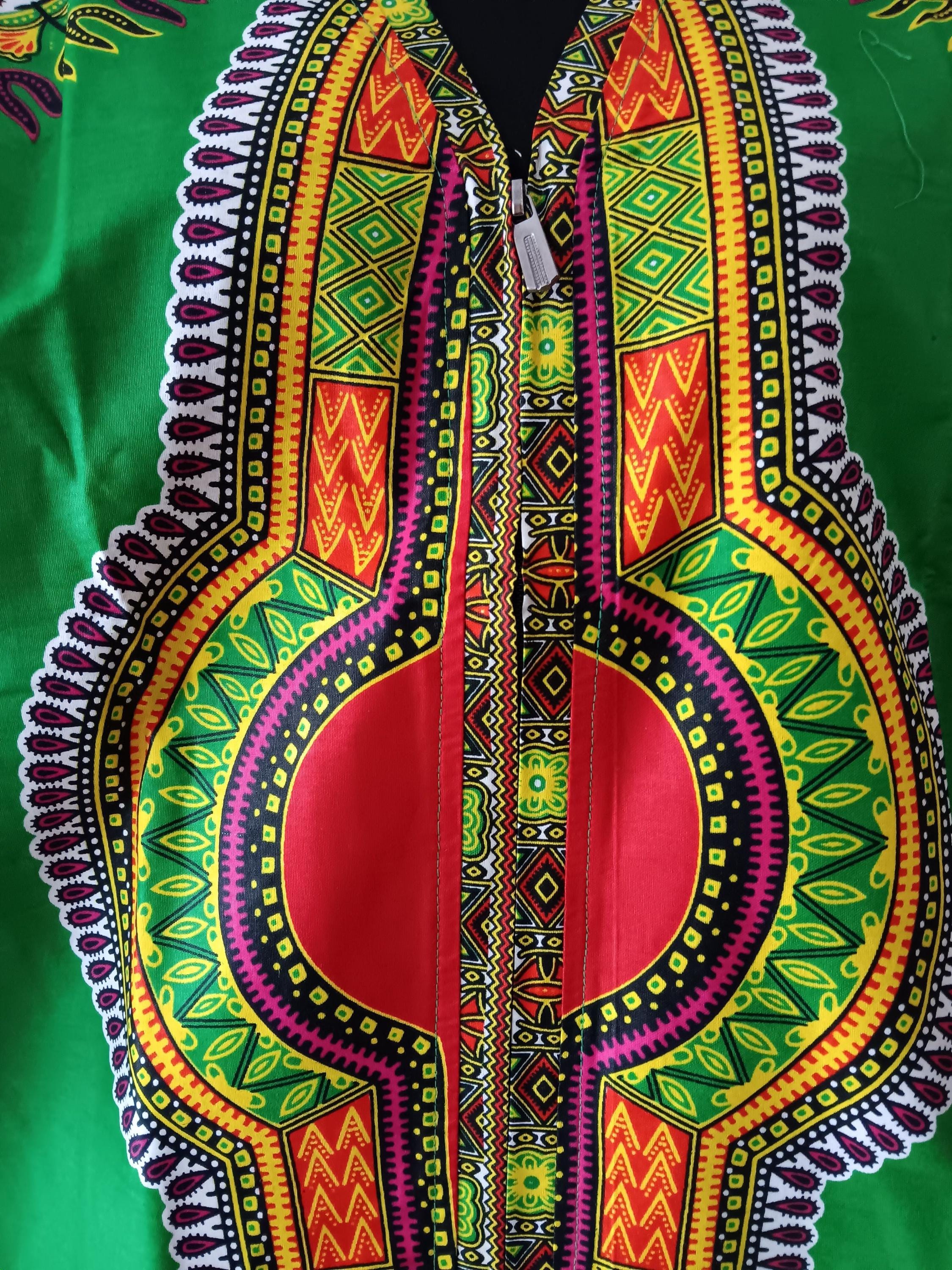Beautiful Africa Dashiki print fabric. Colors are Green, orange, red, yellow, dark pink, white and black. Well-made garment. 100% Cotton.