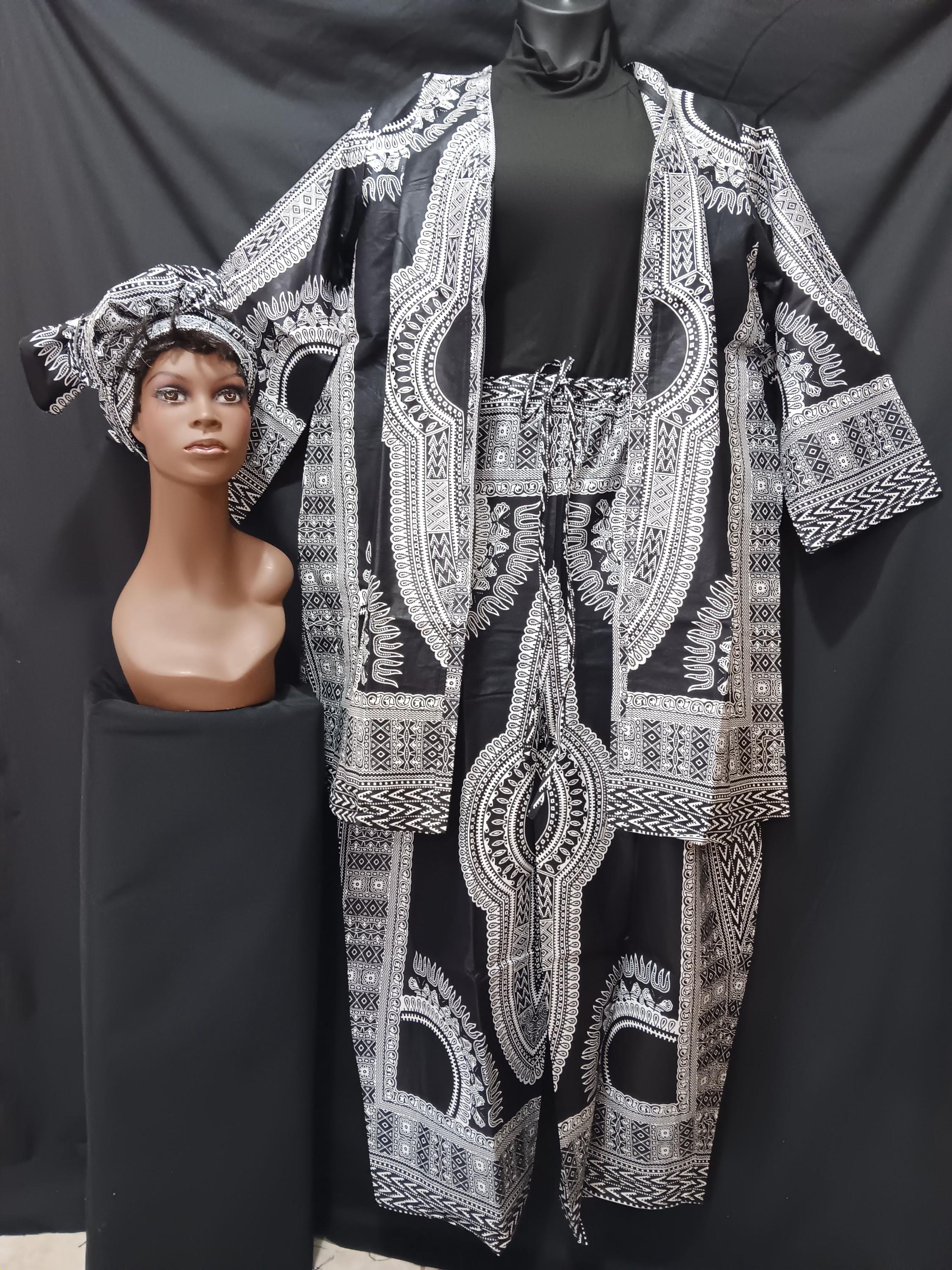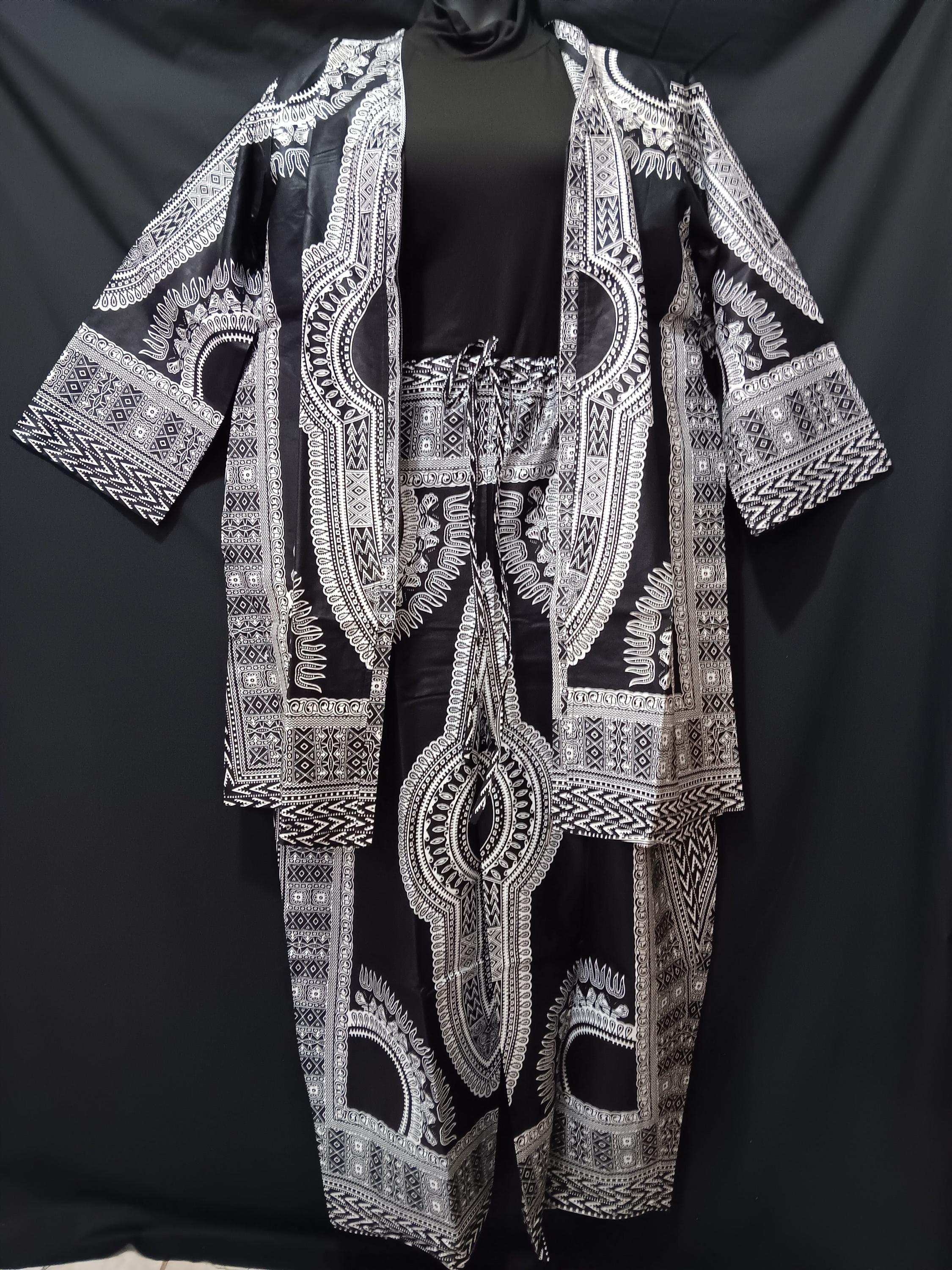Lovely Africa inspired 3pc Duster Pants set. Long sleeve ankle length kimono top with pockets, elastic waist tie belt pants with pockets and matching headwrap.