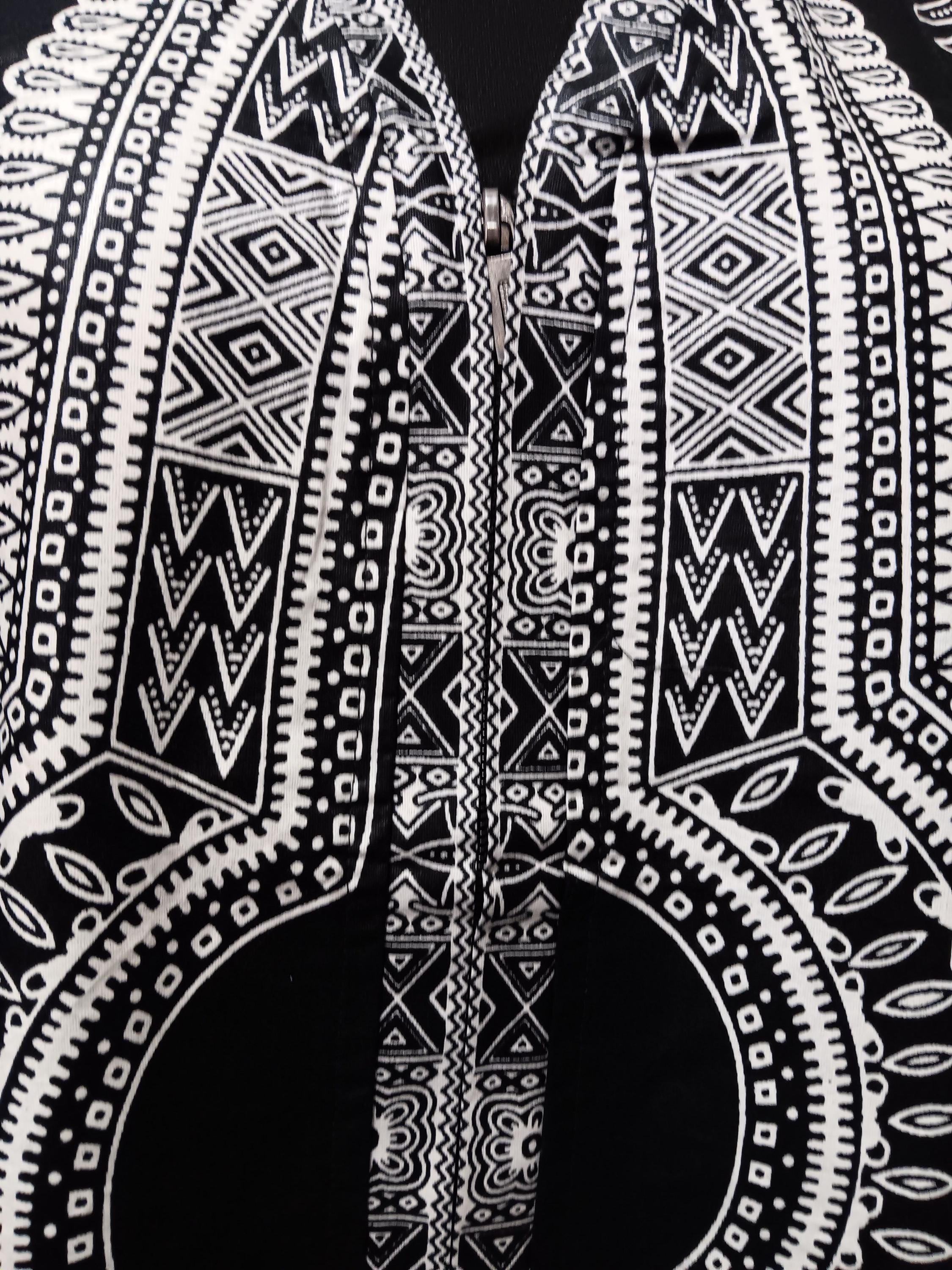Beautiful Africa Dashiki print fabric. Colors are Black and white. Well-made garment. 100% Cotton.