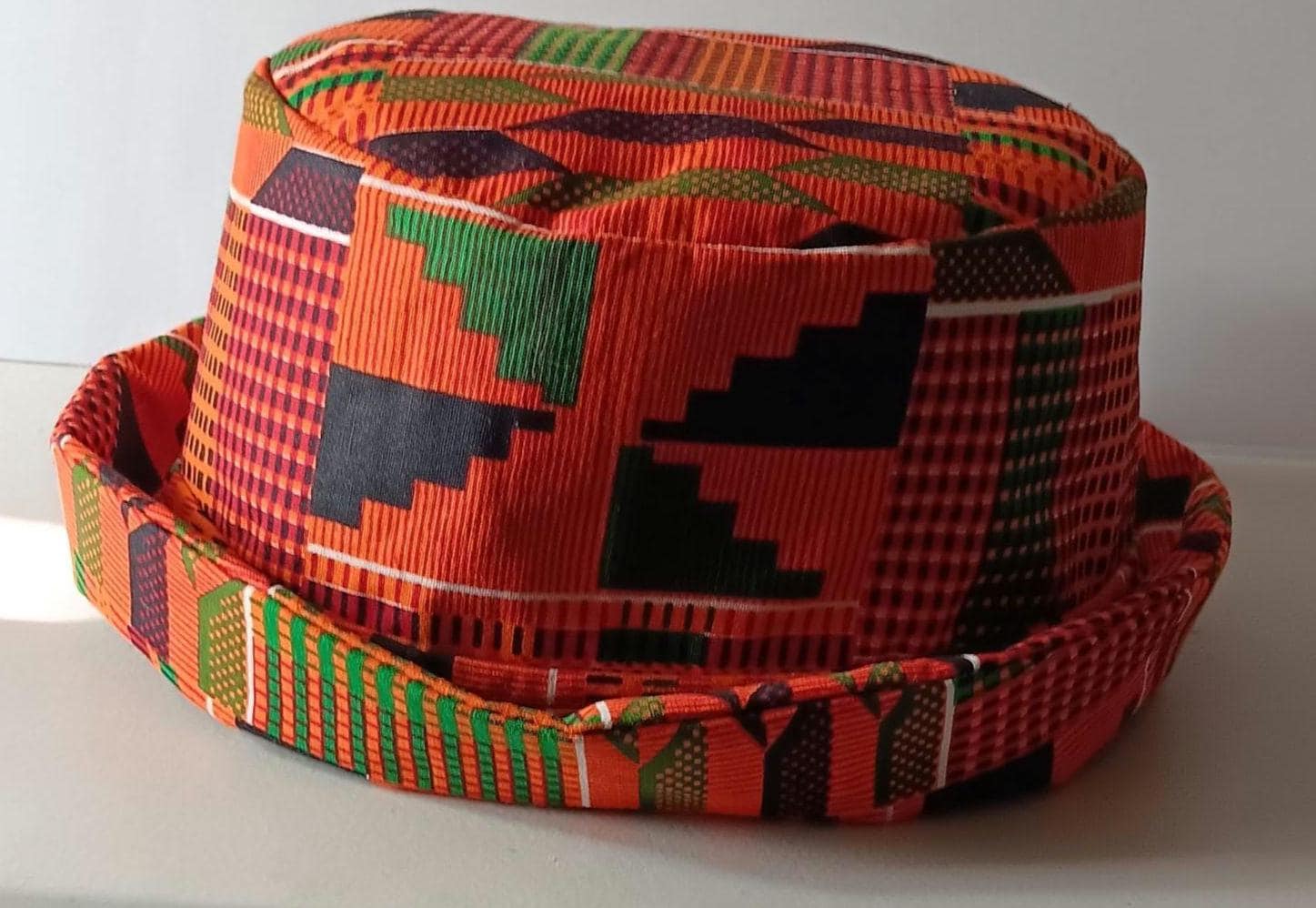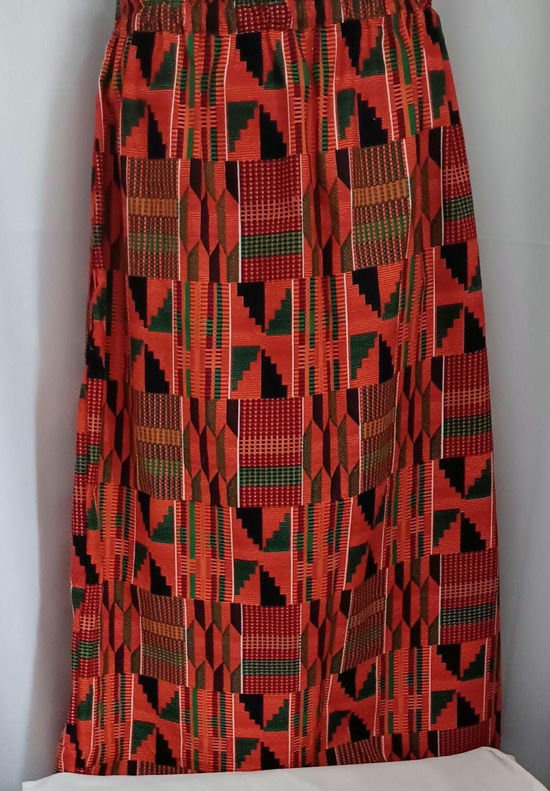 Beautiful Africa print straight Skirt with pockets, elastic waist and matching bucket hat. Lovely, classy, simple skirt. Made of 100% Cotton. Africa inspired fabric print colors orange, green, black. Skirt be worn for cultural events, Black History Month, Kwanzaa, or everyday all occasions.