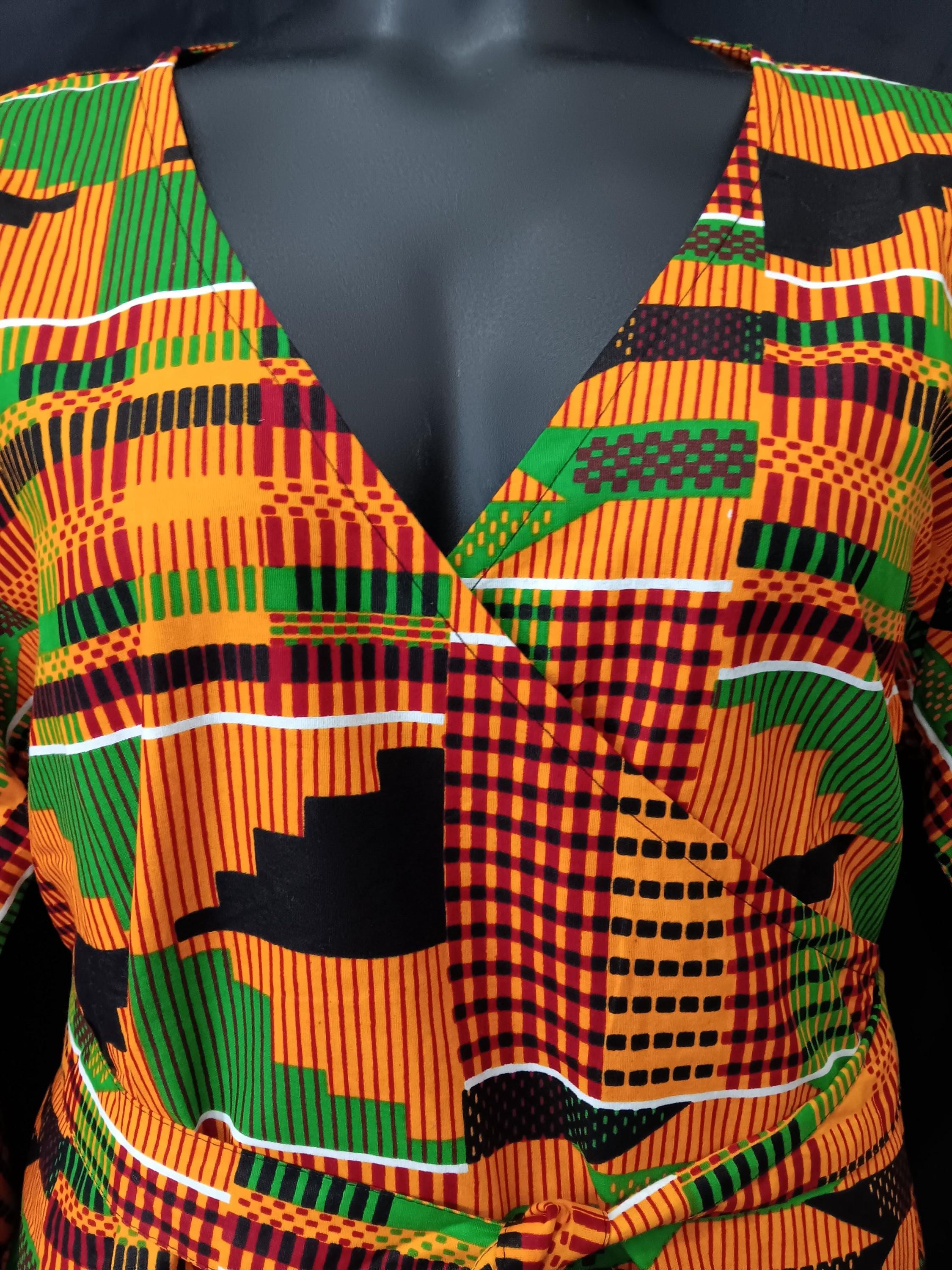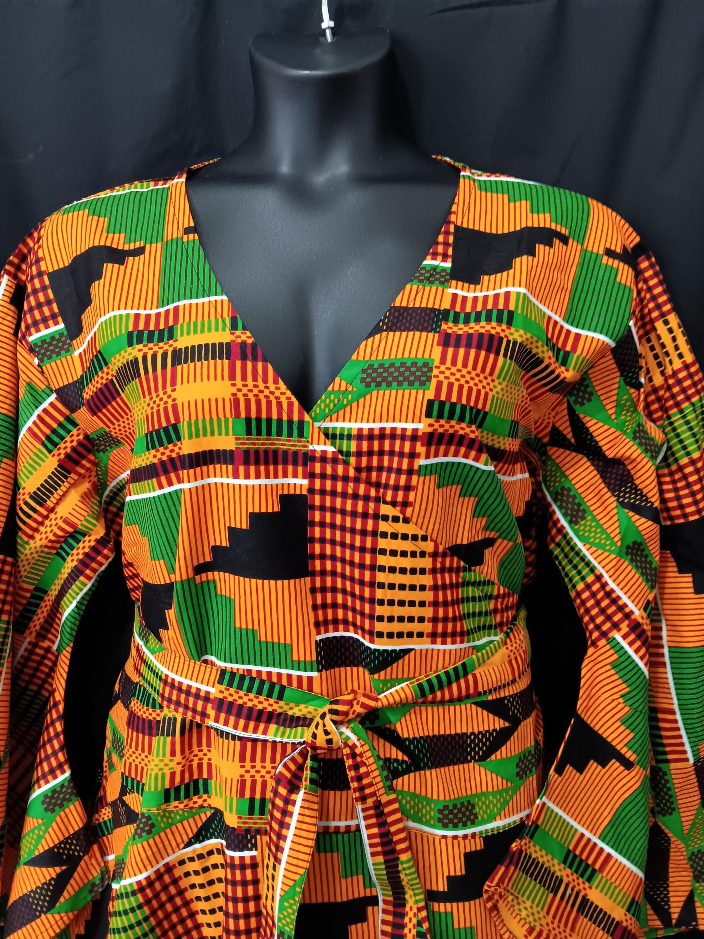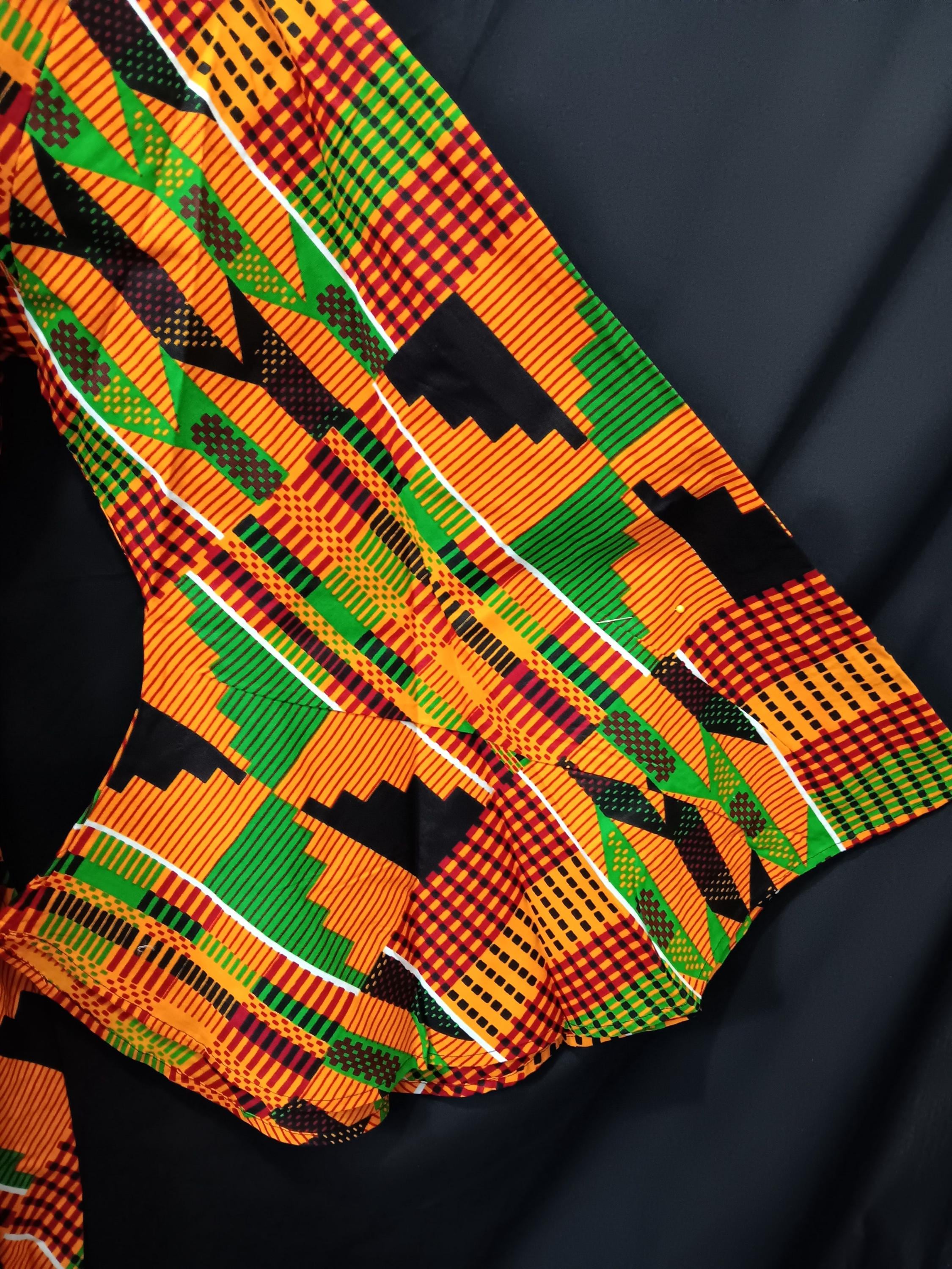 Beautiful African Kente cloth print fabric. Goldish yellow, orange, green, red, white and black. Long trumpet sleeves, ankle length dress with pockets. Dress has a full flare skirt.