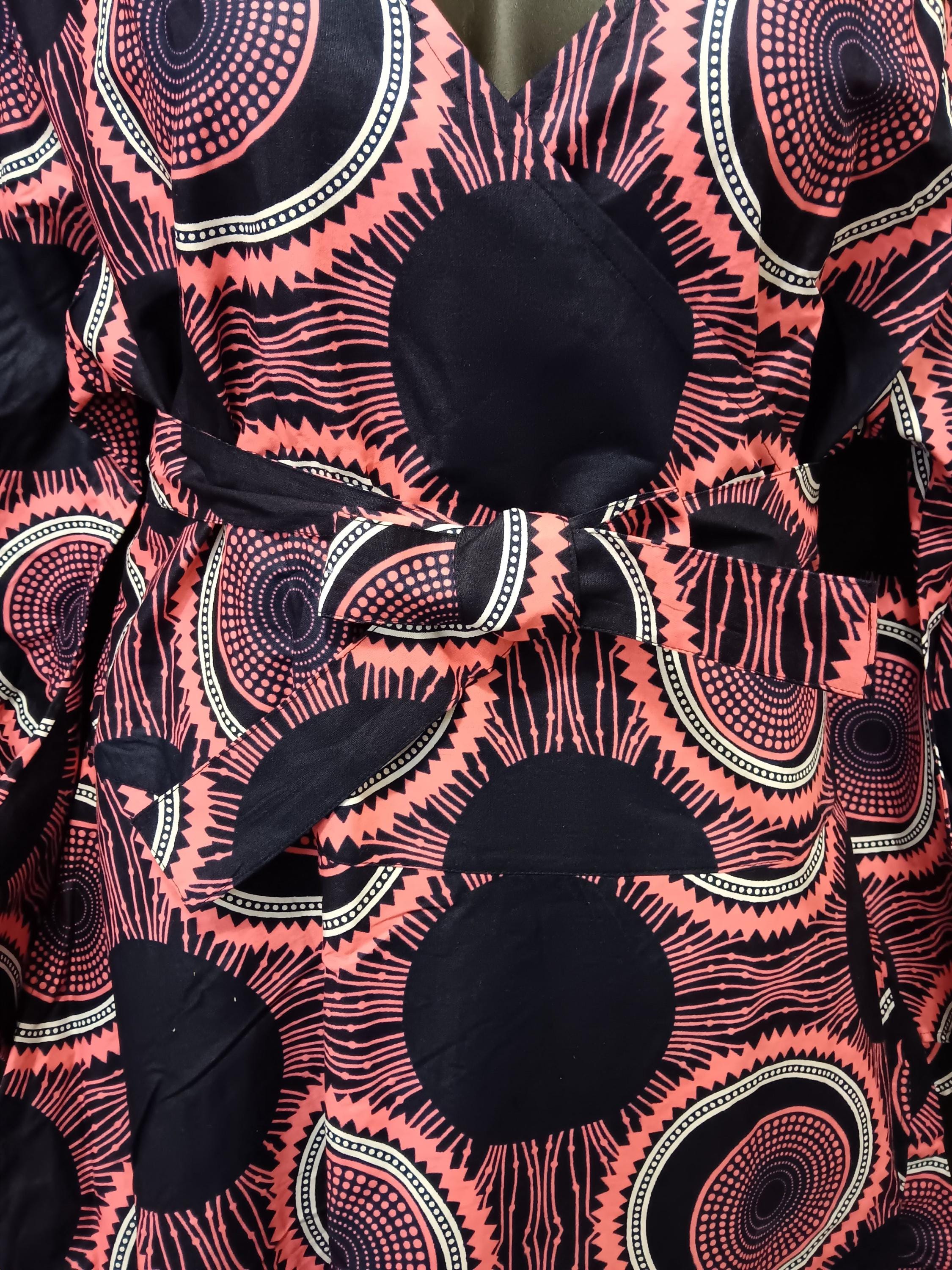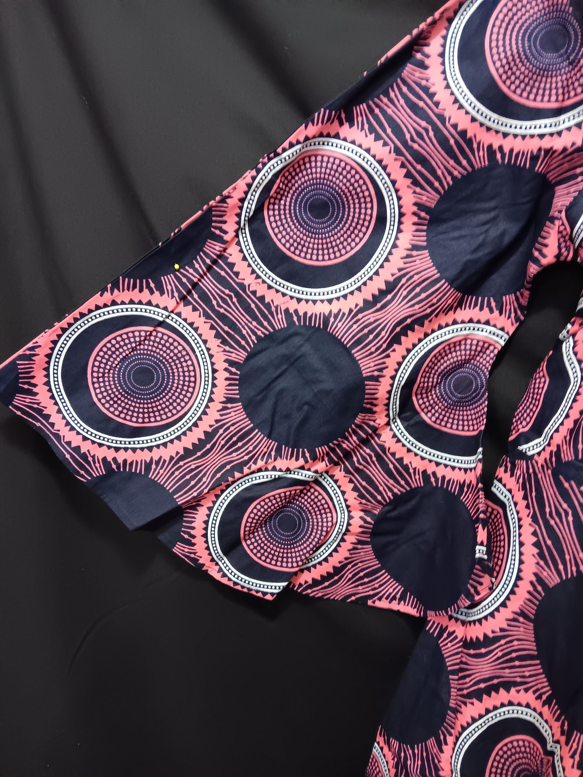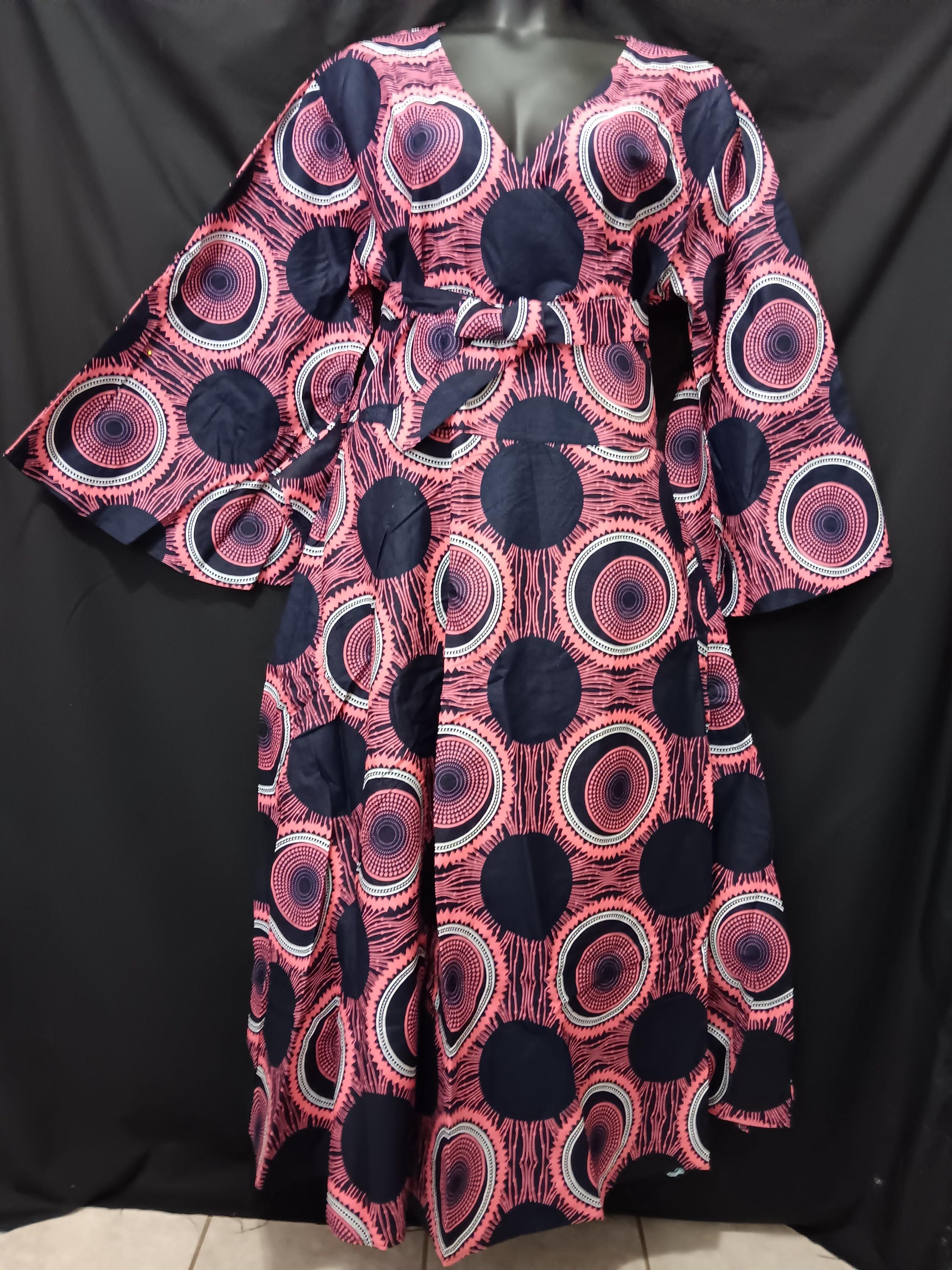 Beautiful African print fabric. Colors are Black, warm pink and white. Long trumpet sleeves, ankle length dress with pockets. Dress has a full flare skirt.