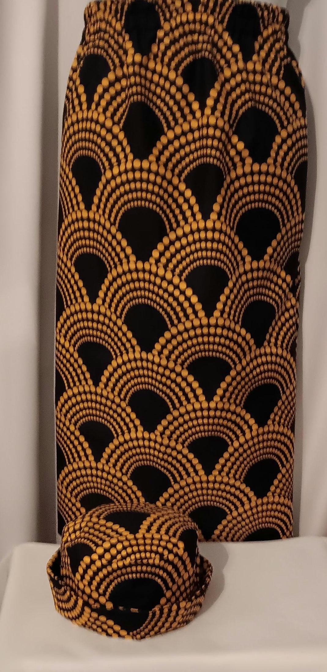 Beautiful Africa print straight Skirt with pockets, elastic waist and matching bucket hat. Lovely, classy, simple skirt. Made of 100% Cotton. Africa inspired fabric print colors black, gold, Skirt can be worn for cultural events, Black History Month, Kwanzaa, or everyday all occasions.