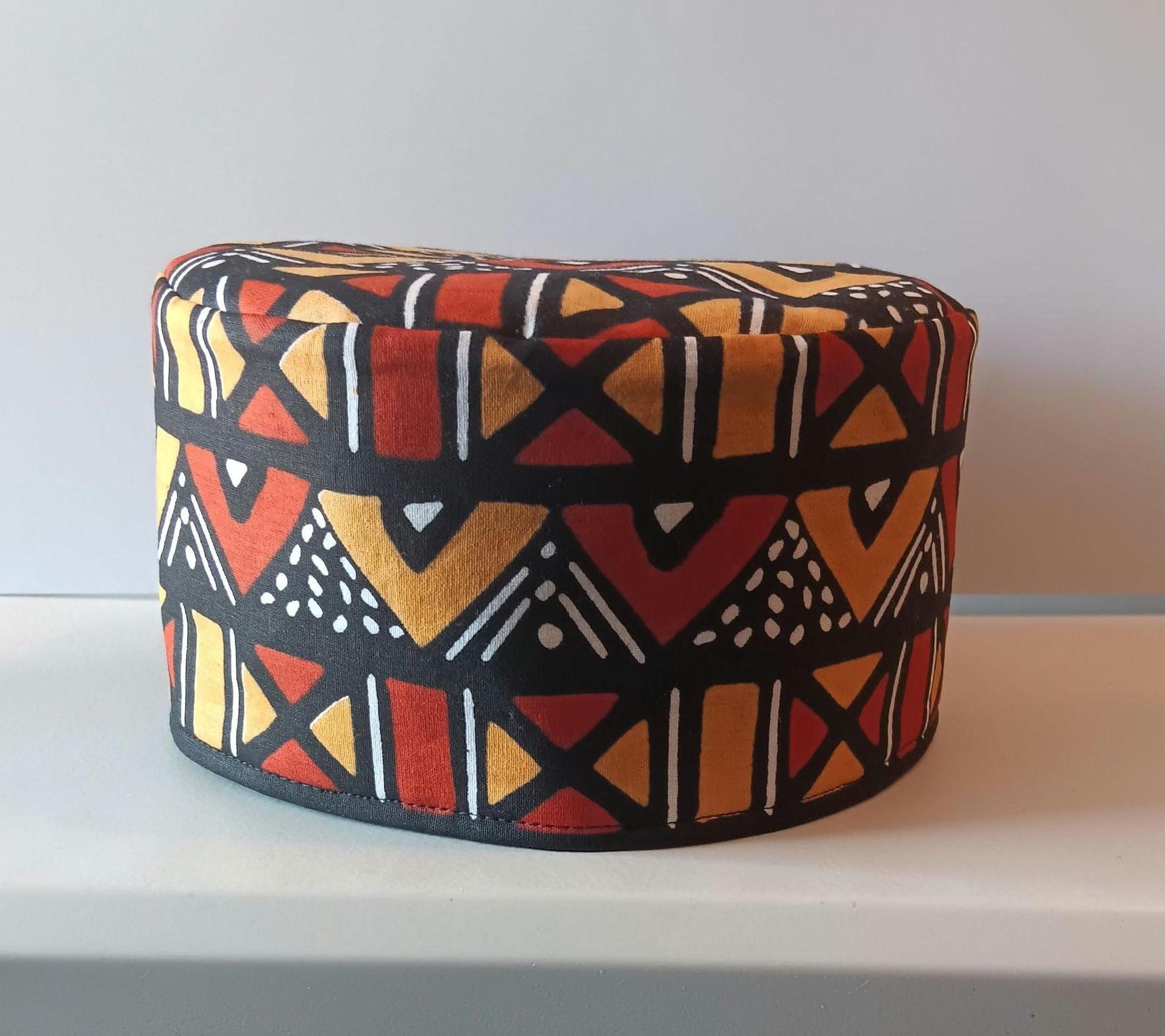 This is a beautiful African faux Mud cloth print Kufi hat. Fabric is cotton and polyester. Kufi hat colors are black and dark gold, white, burgundy