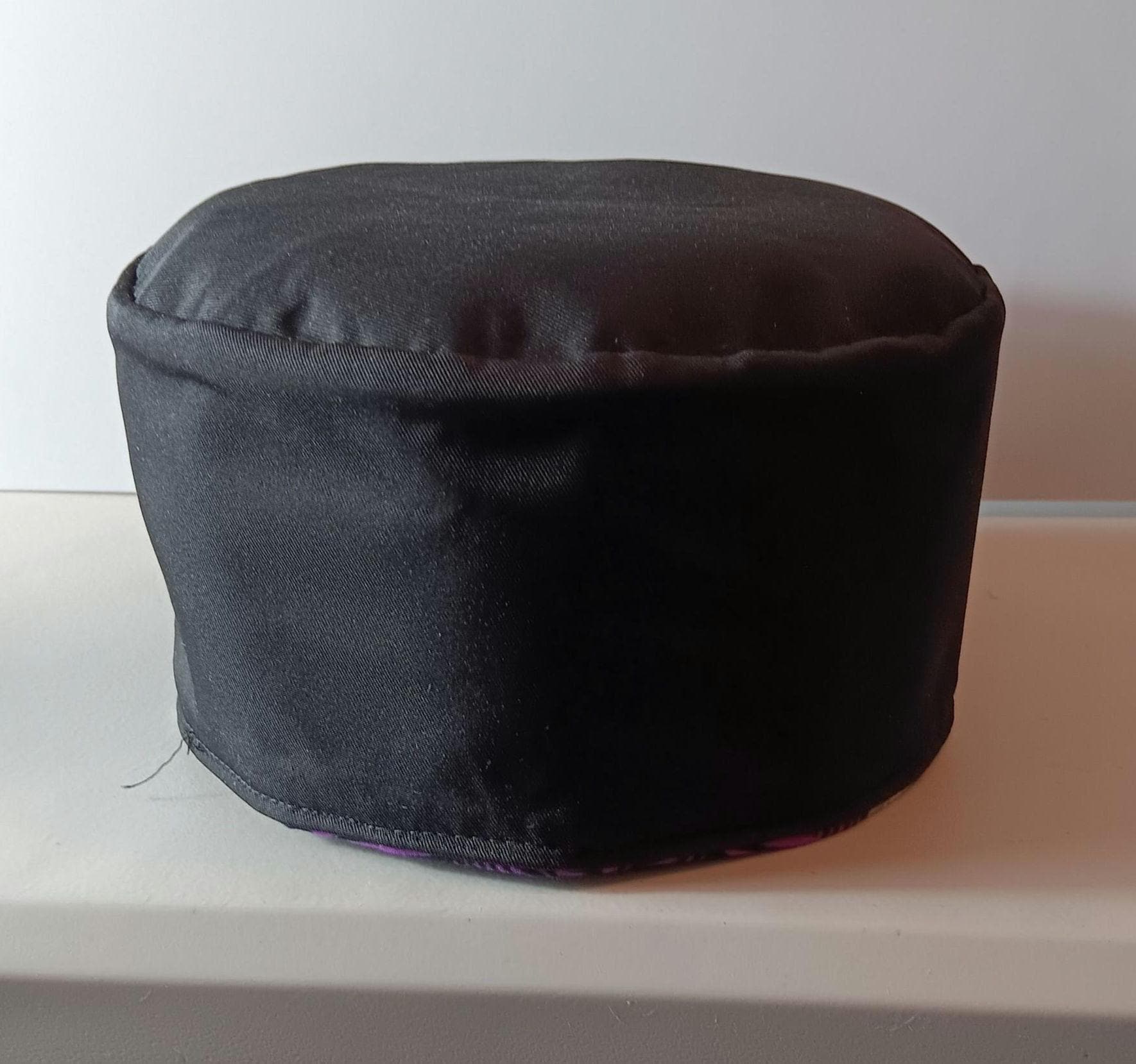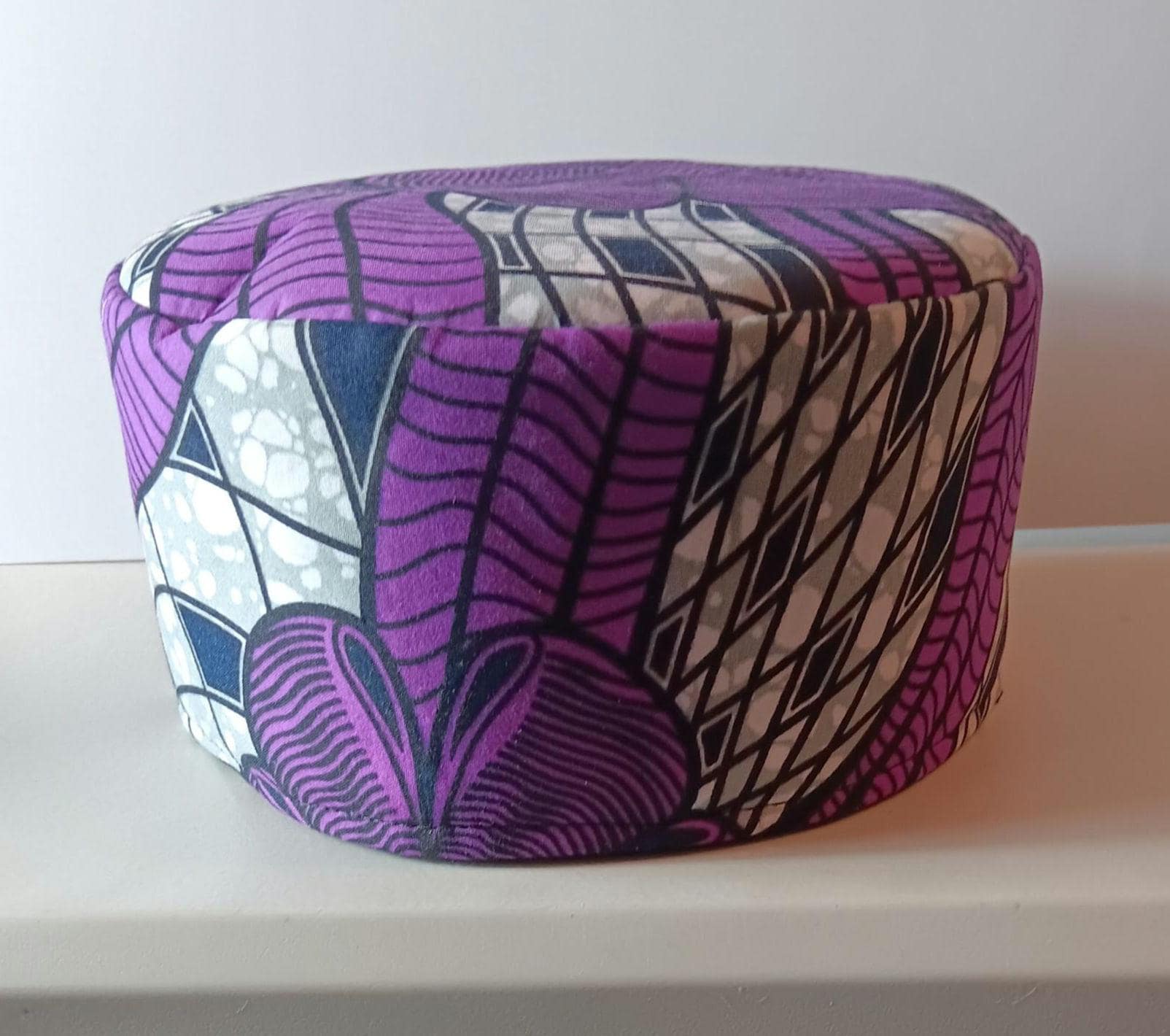 This is a beautiful African faux Mud cloth print Kufi hat. Fabric is cotton and polyester. Kufi hat colors are black and white,purple a.f light gray.