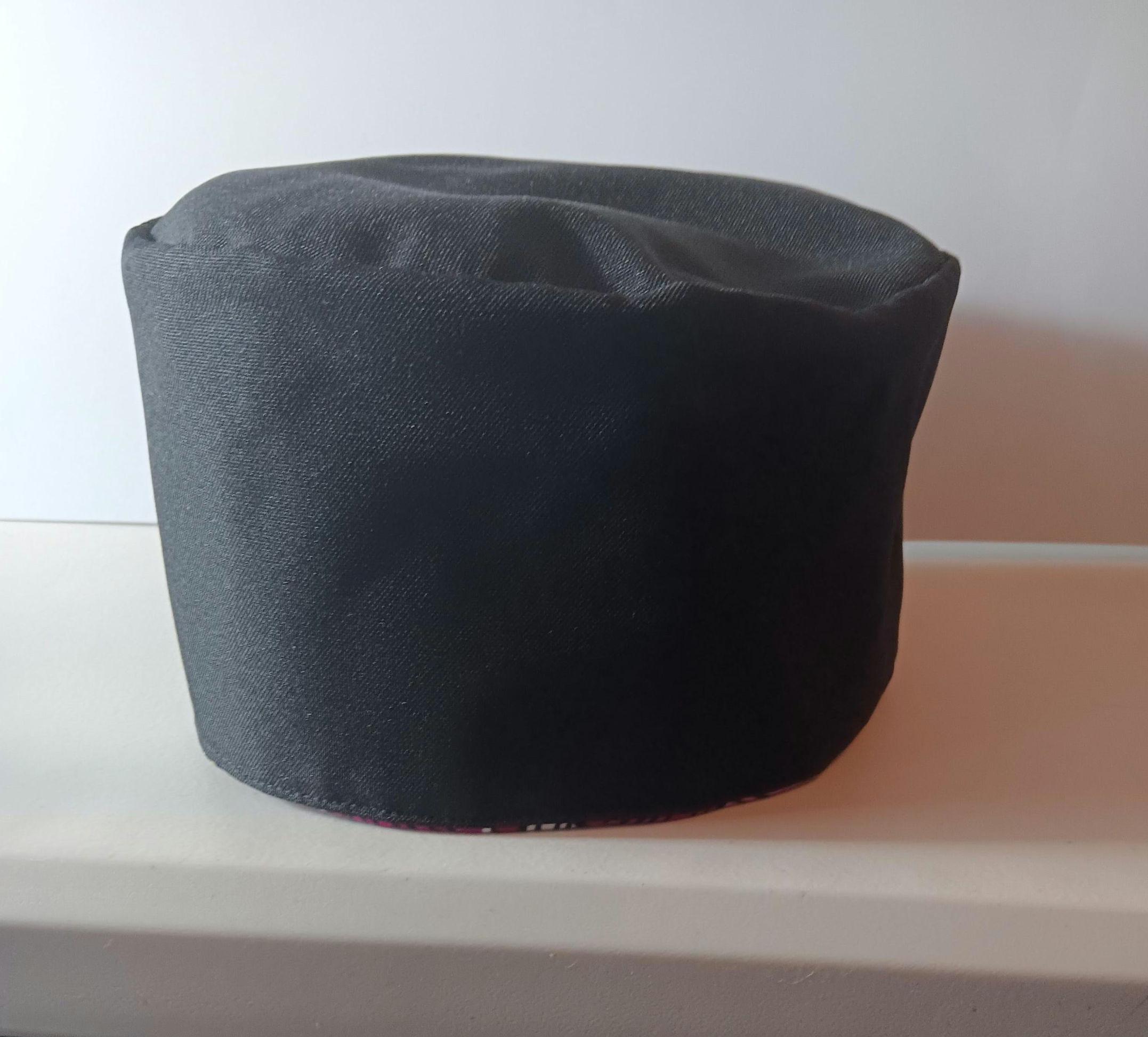 This is a beautiful African faux Mud cloth print Kufi hat. Fabric is cotton and polyester. Kufi hat colors are black white pink and burgundy