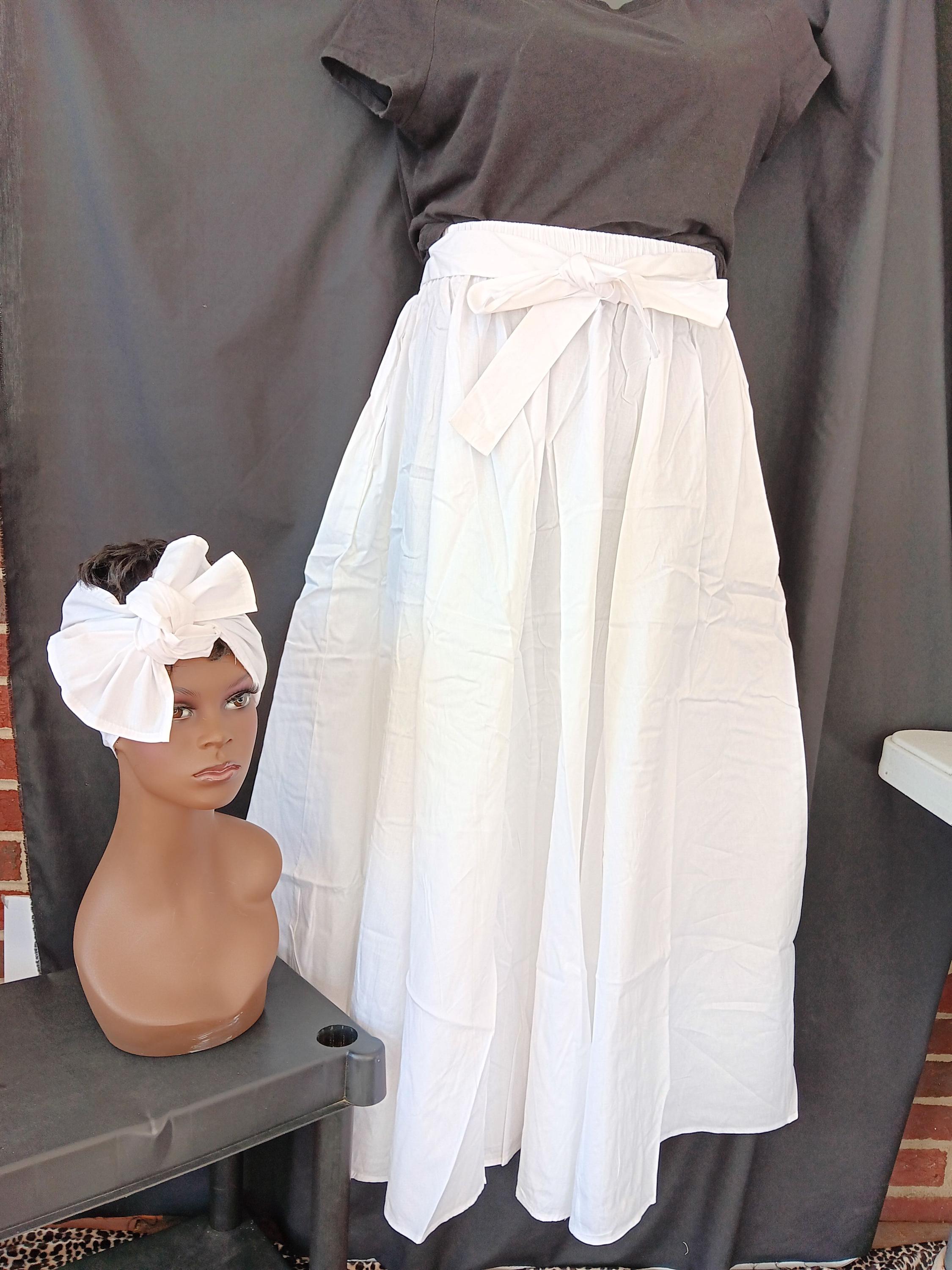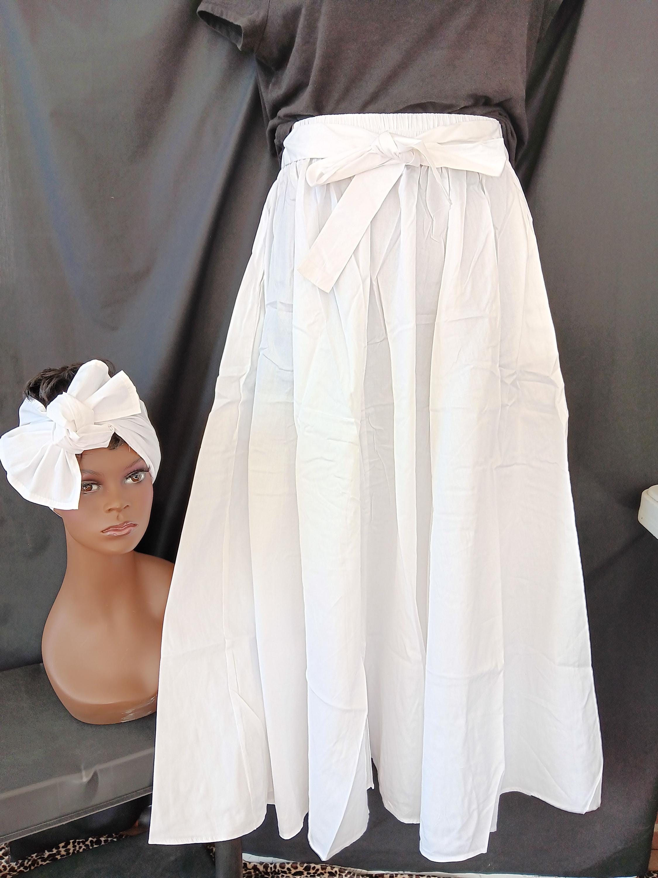 Beautiful African Inspired ALL White skirt with pockets, 8 panels (very full), ankle length, attached waist tie belt, and matching headwrap, pockets. Lovely flowing skirt. Made of 100% Cotton. Skirt can be worn for cultural events, Kwanzaa, or everyday all occasions. Great for Weddings and Graduation.